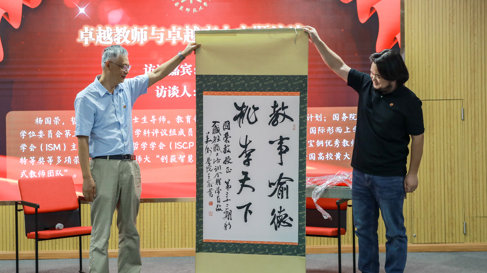 访谈后,美术学院新入职教师王方呈老师代表本期新入职教师送上为杨国荣教授创作的书法作品《教事喻德桃李天下》,表达对前辈的敬意。