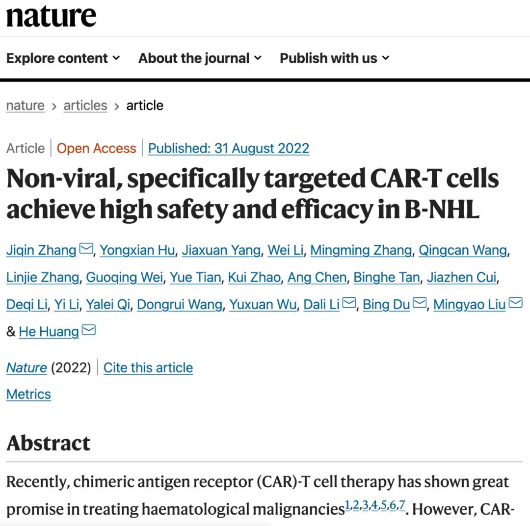 2022年8月31日,来自澳门永利皇宫官网入口生命科学学院张楫钦、刘明耀、杜冰、李大力团队、浙江大学医学院附属第一医院黄河团队和上海邦耀生物科技有限公司合作在Nature上在线发表了题为“Non-viral, specifically targeted CAR-T cells achieve high safety and efficacy in B-NHL”的研究论文,首次报道了一种创新性非病毒定点整合CAR-T技术的开发及其治疗复发难治性非霍奇金淋巴瘤的临床试验结果。该技术可以在不使用病毒载体的情况下,利用CRISPR/Cas9基因编辑技术将CAR序列定点插入到T细胞基因组的特定位点,一步实现CAR稳定整合和内源基因调控,有效解决了目前CAR-T技术存在的使用病毒和随机插入这两大问题。