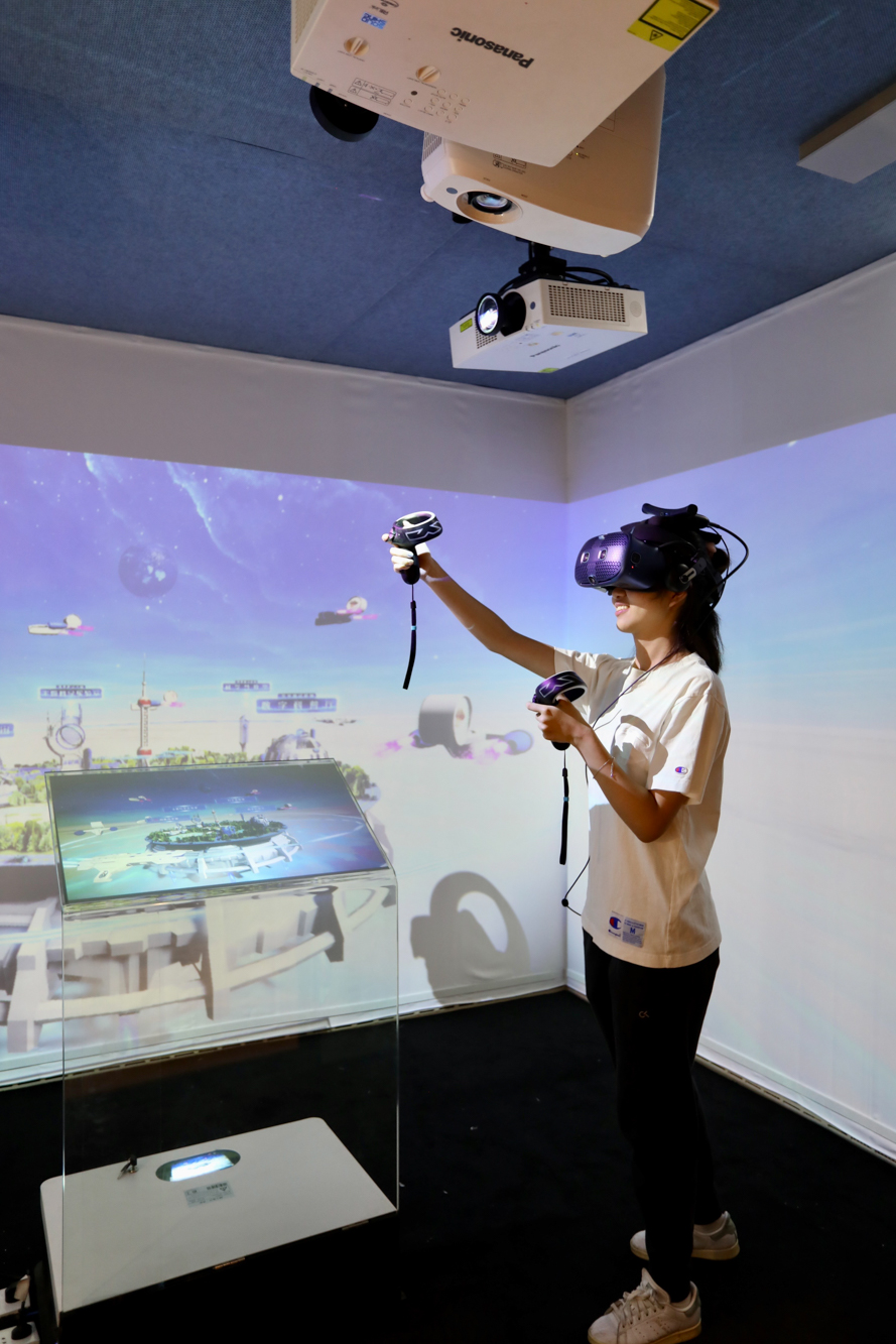 澳门永利皇宫官网入口教育信息技术系鲁力立老师分享了面向中小学的教育元宇宙科技空间场景解决方案,方案设计建造了专业、健康、智能的舱体,包含集成式沉浸技术、百种优质教育资源、针对中小学生的科幻空间与人物形象,三通路(VR眼镜、平板AR、裸眼3D)接入定制化云平台,并邀请现场嘉宾进入教育元宇宙接入舱进行沉浸式体验。
