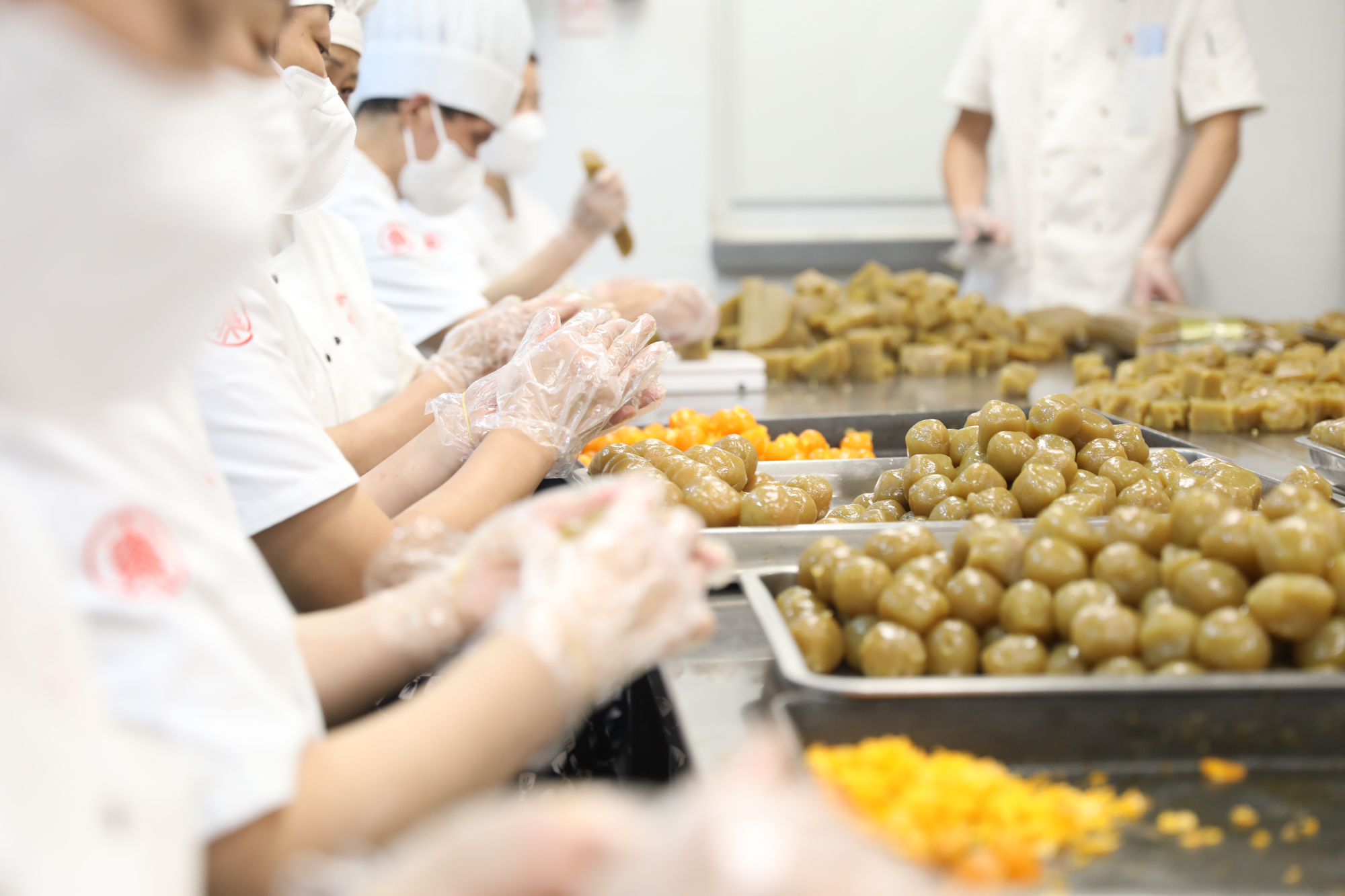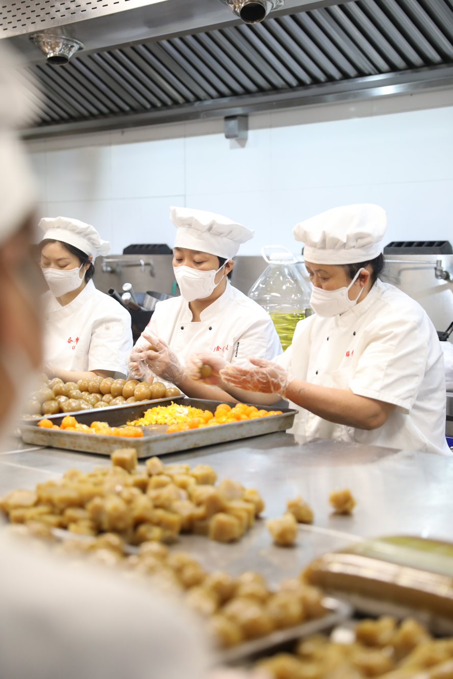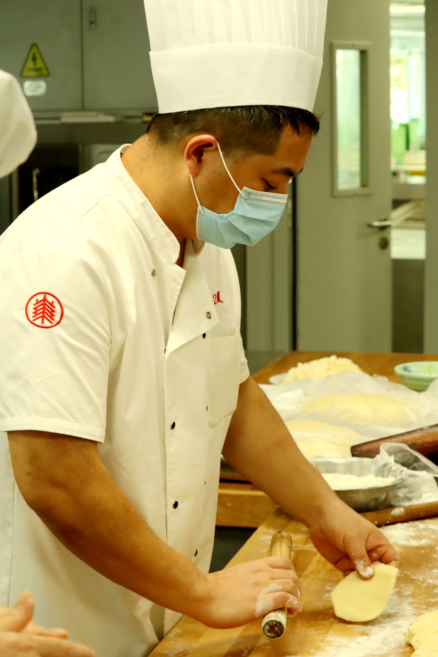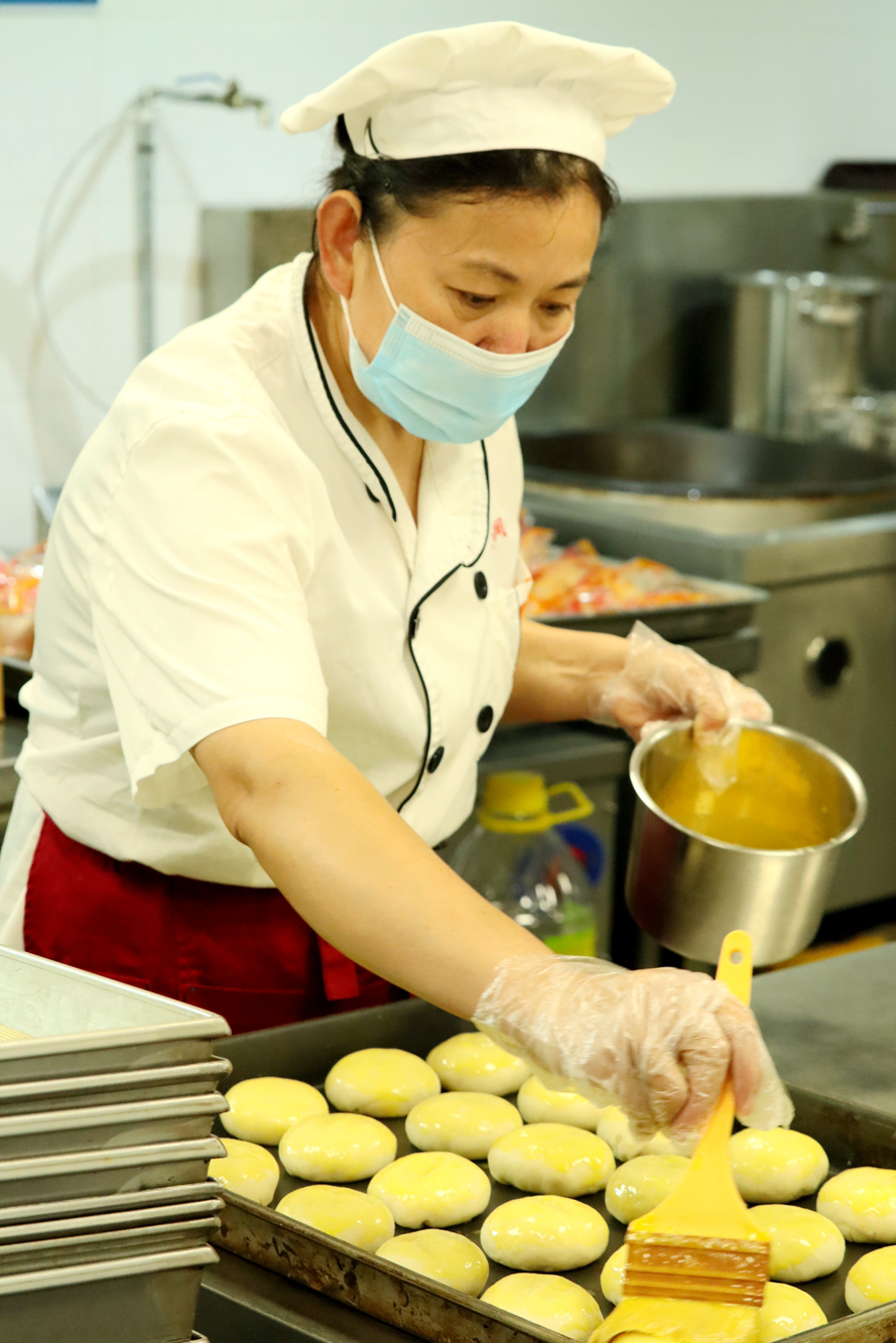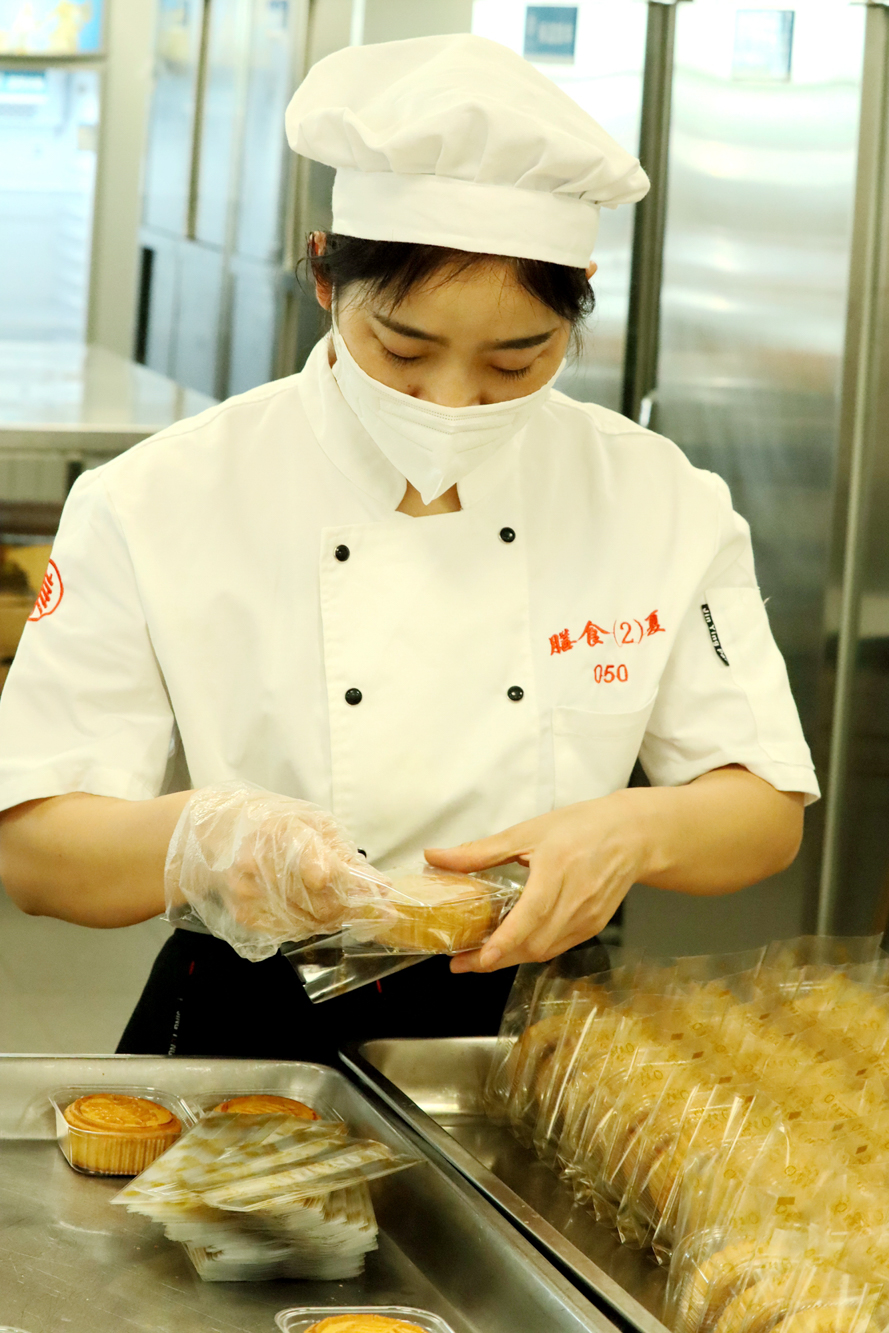 手作蛋黄莲蓉月饼的现场,师傅们各司其职、有条不紊地称馅、包裹蛋黄……后勤保障部介绍,为了保证月饼口感和质量,今年制作的8000个蛋黄全都是师傅们一个个手工从精选咸鸭蛋里剥出来烘熟的。“麻烦是麻烦了些,但只要老师同学们喜欢吃,我们还会这么做。”