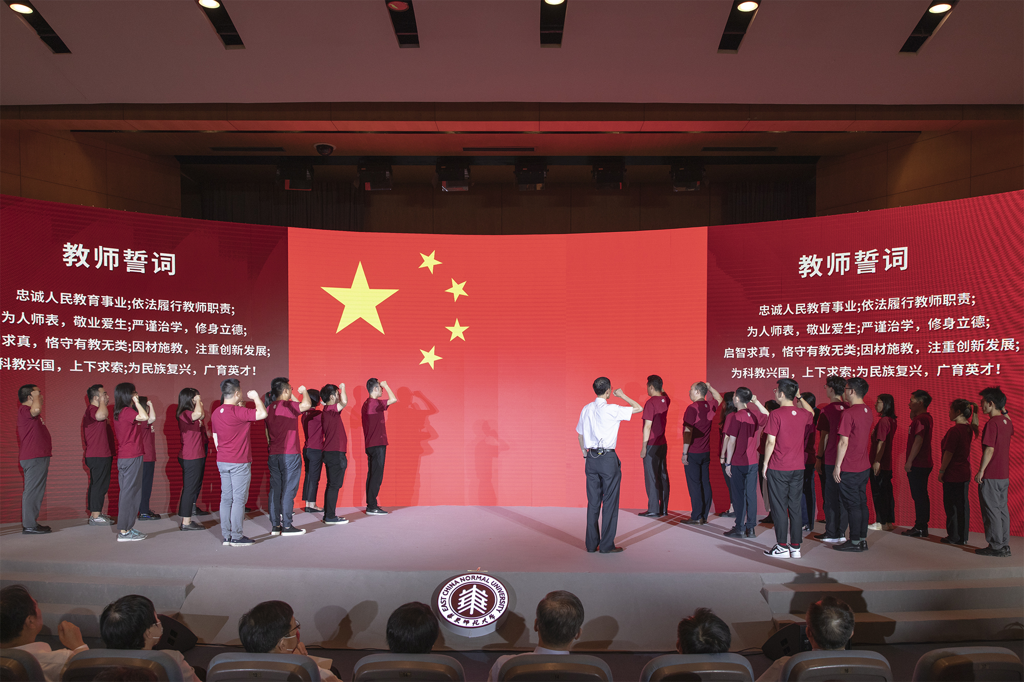 首批黄大年式教师团队负责人、第十三届师德标兵、教育学部教授李政涛带领下新入职的教师们面向国旗庄严宣誓