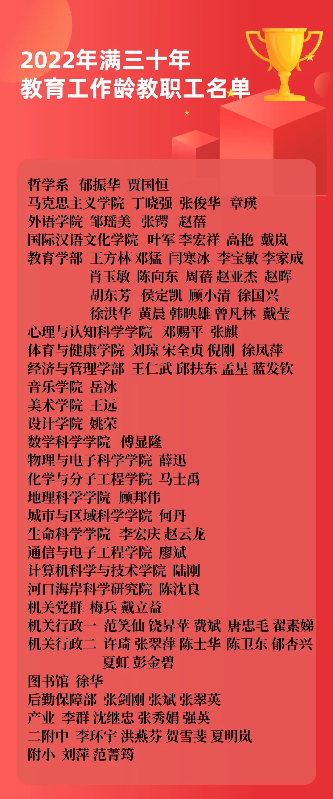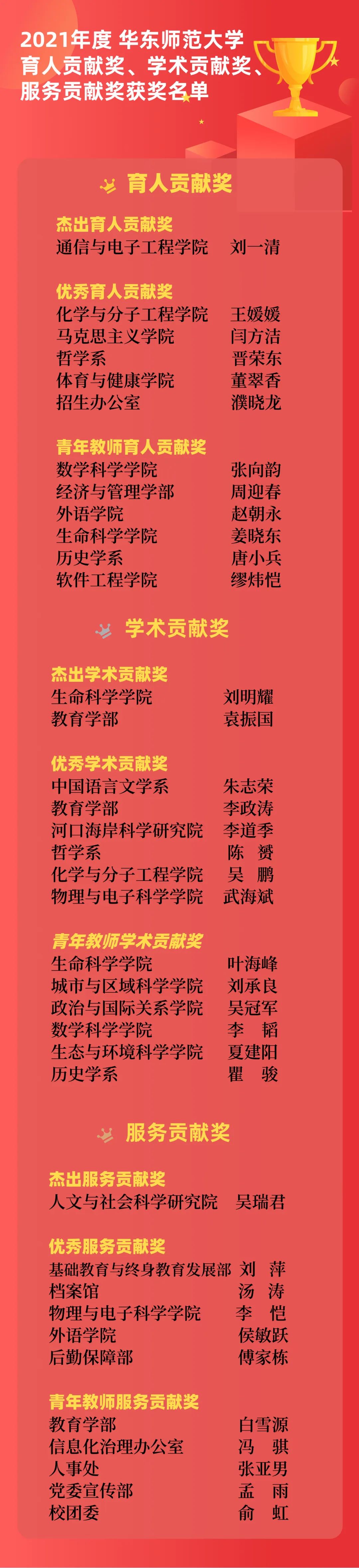 为了奖励在追求卓越育人、卓越学术和一流大学治理中做出突出贡献的教职工,华东师大在梳理、规范以往所设奖项的基础上,传承与创新并重,建校以来首次构建起以育人贡献奖、学术贡献奖、服务贡献奖和校级专项奖为主,部门级专项奖为补充的教职工表彰奖励体系。