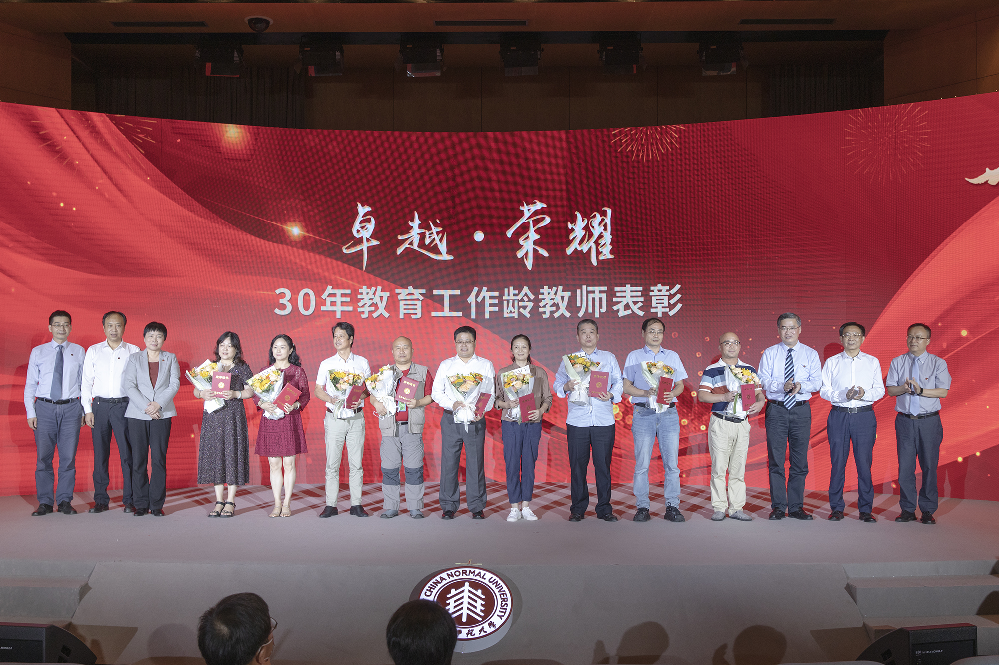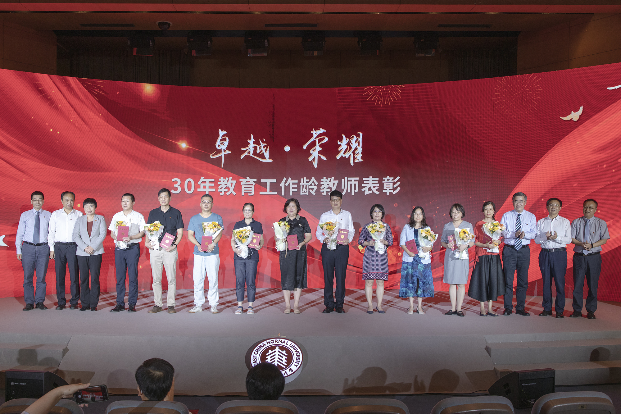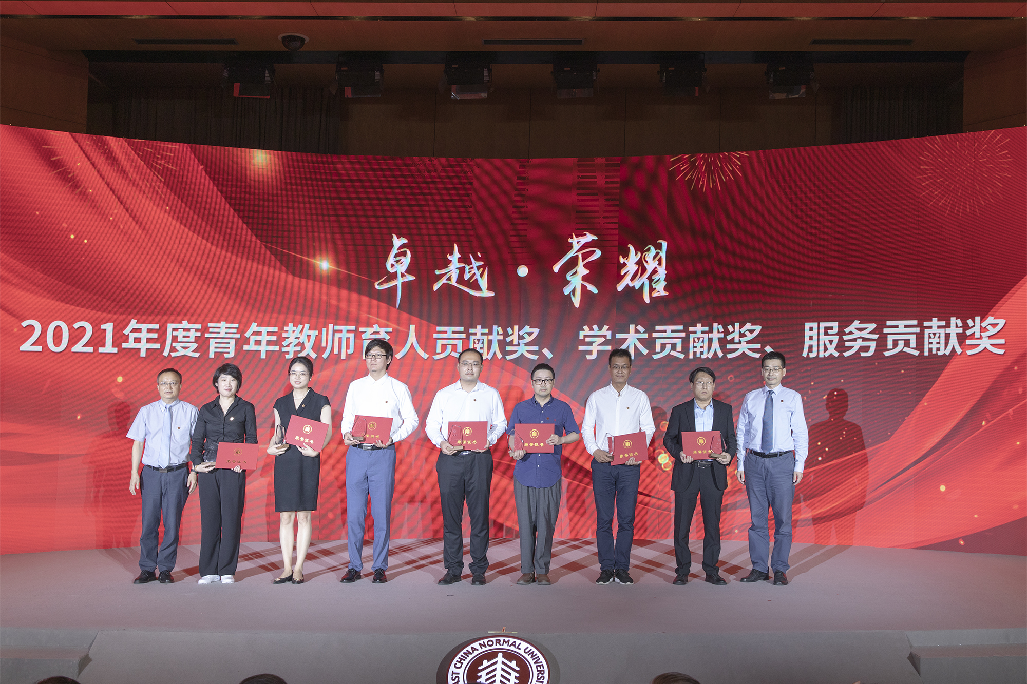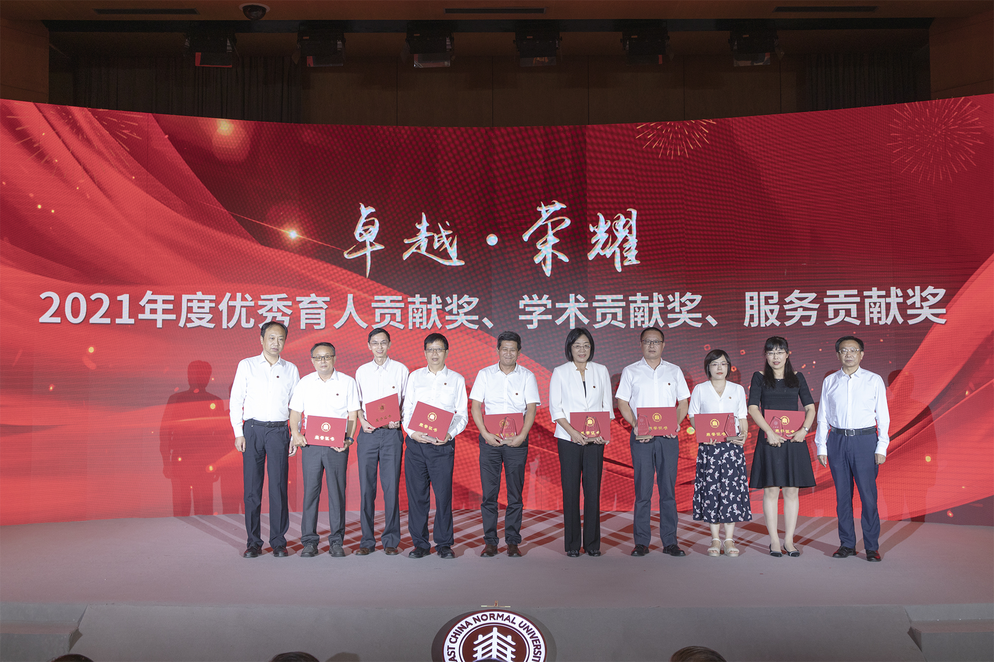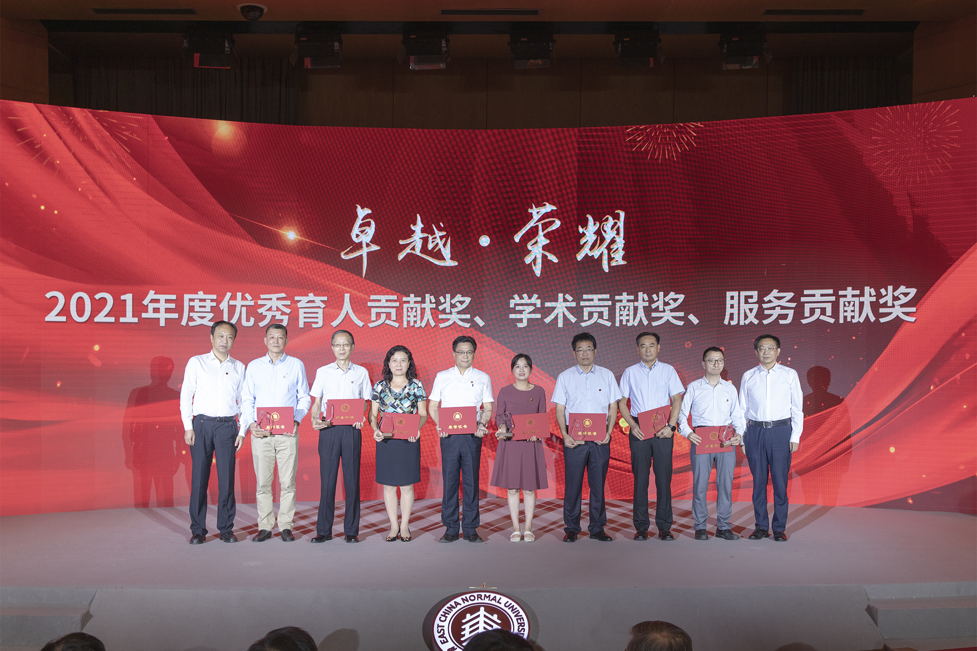 在全场热烈的掌声中,校领导梅兵、钱旭红、朱民、杨昌利、曹友谊、戴立益、雷启立、顾红亮分别为学校2021年度育人贡献奖、学术贡献奖、服务贡献奖获得者,第十三届师德标兵荣誉称号获得者,满30年教育工作龄的教师颁发证书、奖杯,今年新入职的教师代表向受表彰的教师献花致敬。