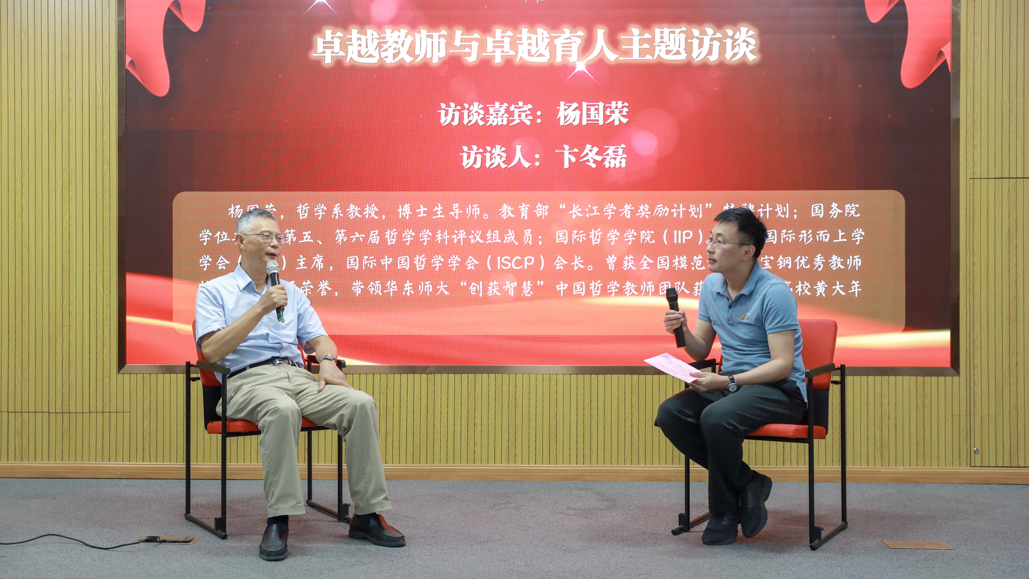 访谈中,杨国荣回顾了自身的从教历程,以辩证视角剖析了 “人师”与“经师”的关系,并对“青年教师如何站稳讲台、实现卓越育人?”“如何在学术上取得突破,提升学术引领力与贡献度?”“如何学会与人合作、组建研究团队?”“如何处理教学、科研、家庭等各方面的压力?”等进行了详细解答。他强调“学无新旧也,无中西也,无有用无用也”,青年教师需要具有开放视野与批判精神,在不断积累的基础上,进行创造性思考。