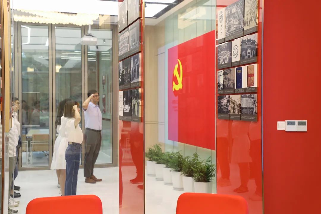 建党百年前夕,崭新的澳门永利皇宫官网入口党建服务中心横空出世。这片由办公楼大厅灰色空间改建而成的“精神家园”,正焕发着蓬勃的生机活力——仰望展厅大门上方的红色墙面,现存于世的唯一一页马克思的《共产党宣言》手稿拓印庄严热忱,寓意“信仰之光照亮共产党人的奋斗之路”。