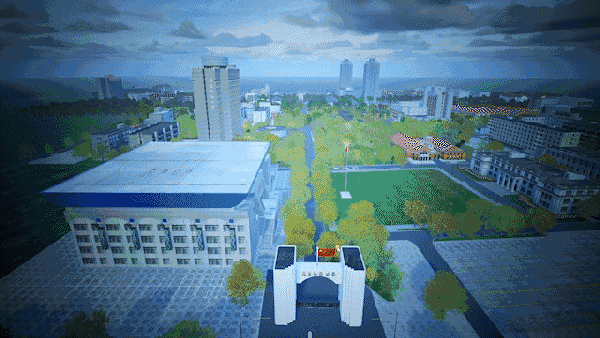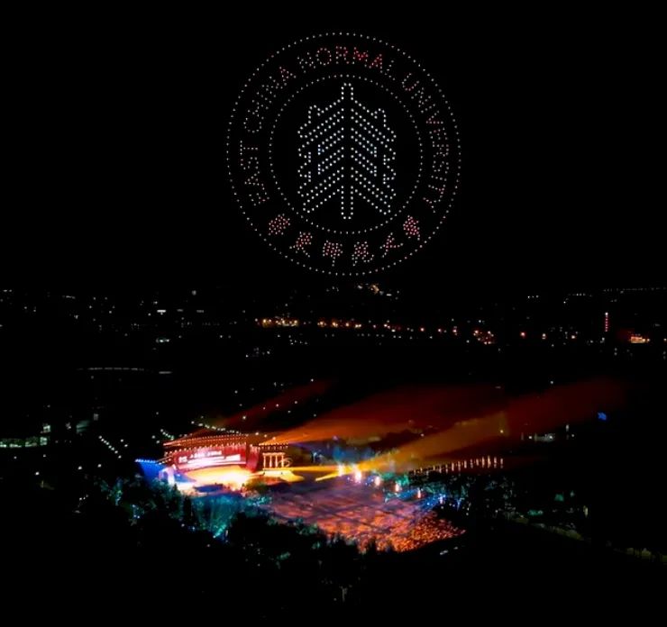 由“穿越千机”公益捐赠的800架无人机编队勾勒校门、群贤堂、校徽等学校元素,祝福华东师大生日快乐。