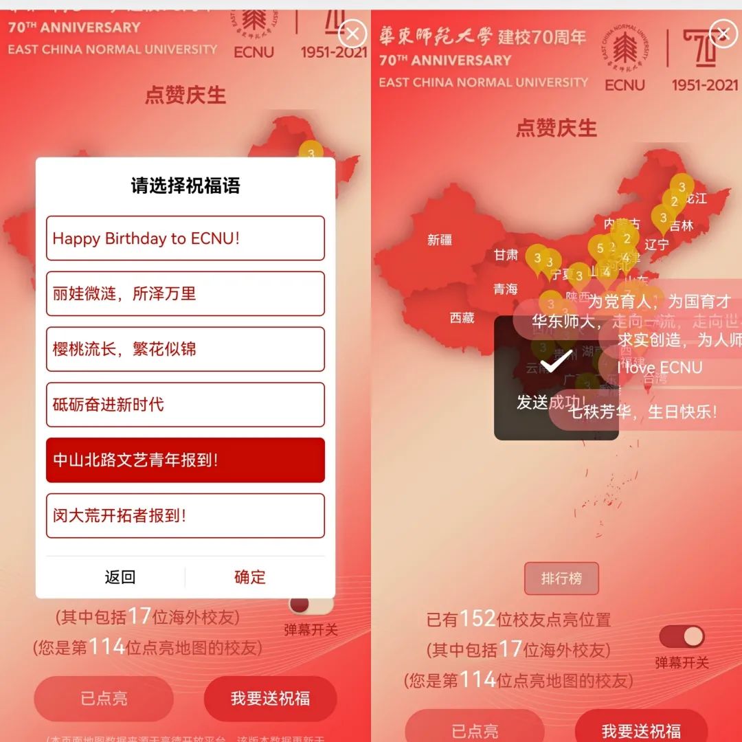 全球57个国家和地区的86个城市校友自发组织开展“旗传四海”活动。校友企业分众传媒在全国76个城市36万块屏幕共同庆祝澳门永利皇宫官网入口生日快乐。10月15-17日晚,上海、武汉、杭州、广州、合肥、南昌6个城市地标建筑接续点亮“师大红”,助力各地校友就近参与共庆母校七秩芳华。