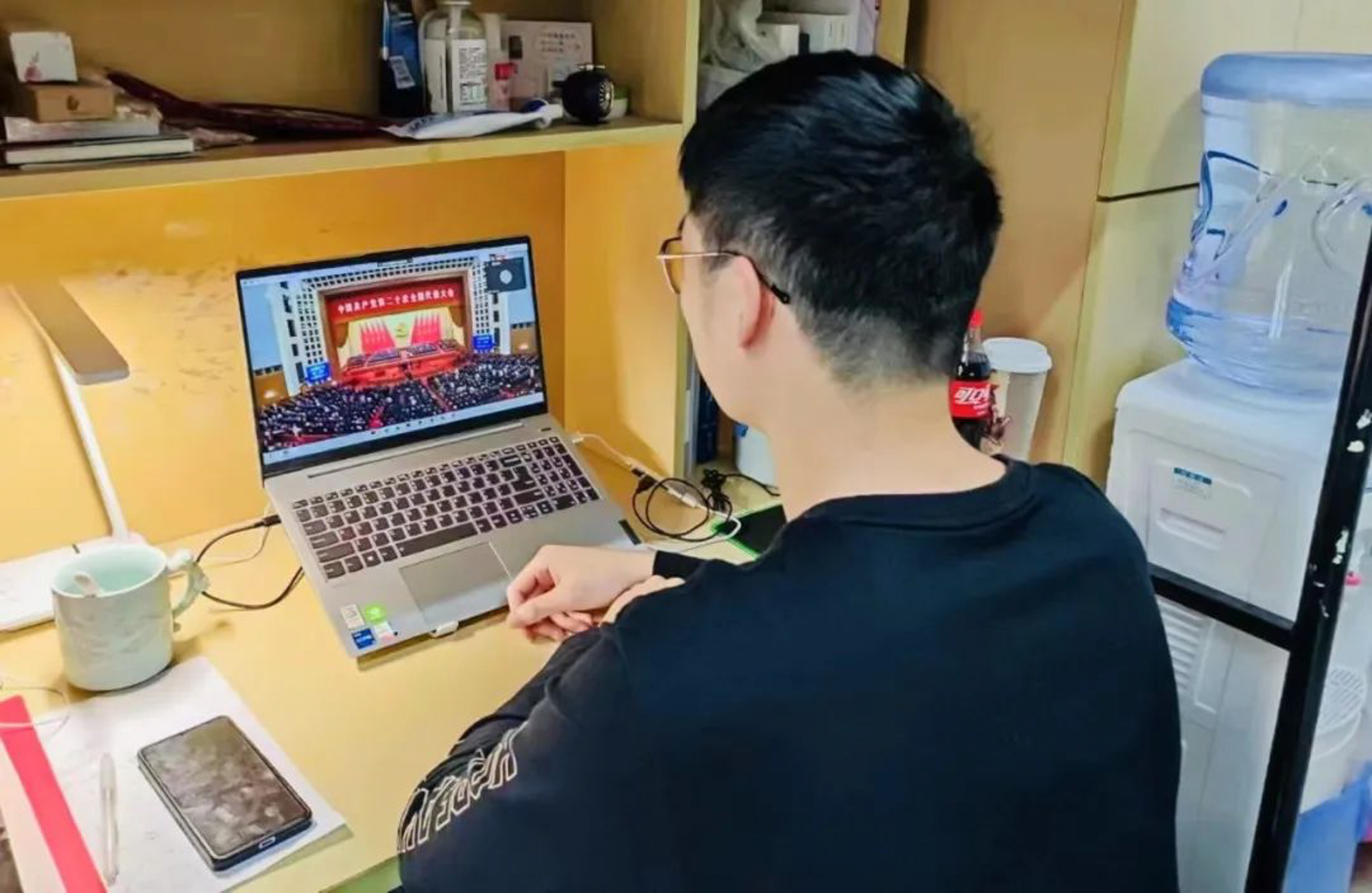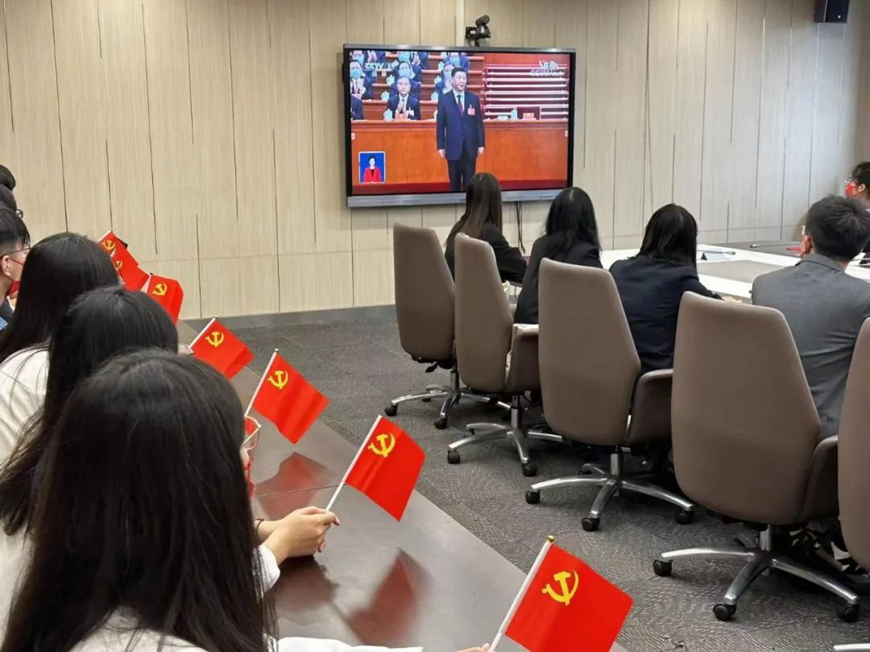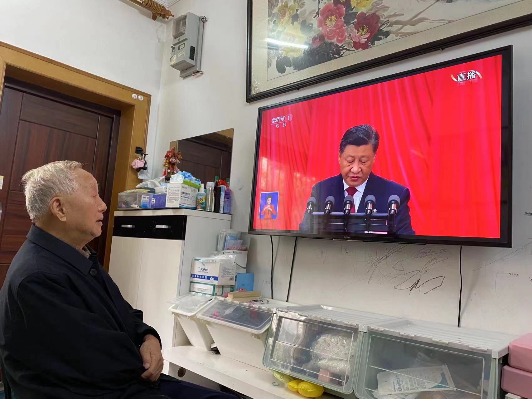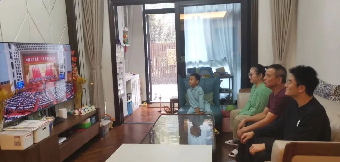 华东师大两校区红旗招展,“热烈庆祝党的二十大胜利召开”的展板分外鲜明,上午10点不到,师生们早早来到屏幕前收看开幕会盛况。华东师大师生或在各会议室、办公室、实验室等公共空间,或在宿舍、家中收看开幕会盛况,一些院系党组织通过开设网络会议室集中收看,关注热议总书记报告。在总书记的报告过程中,收看现场不时自发响起热烈的掌声。