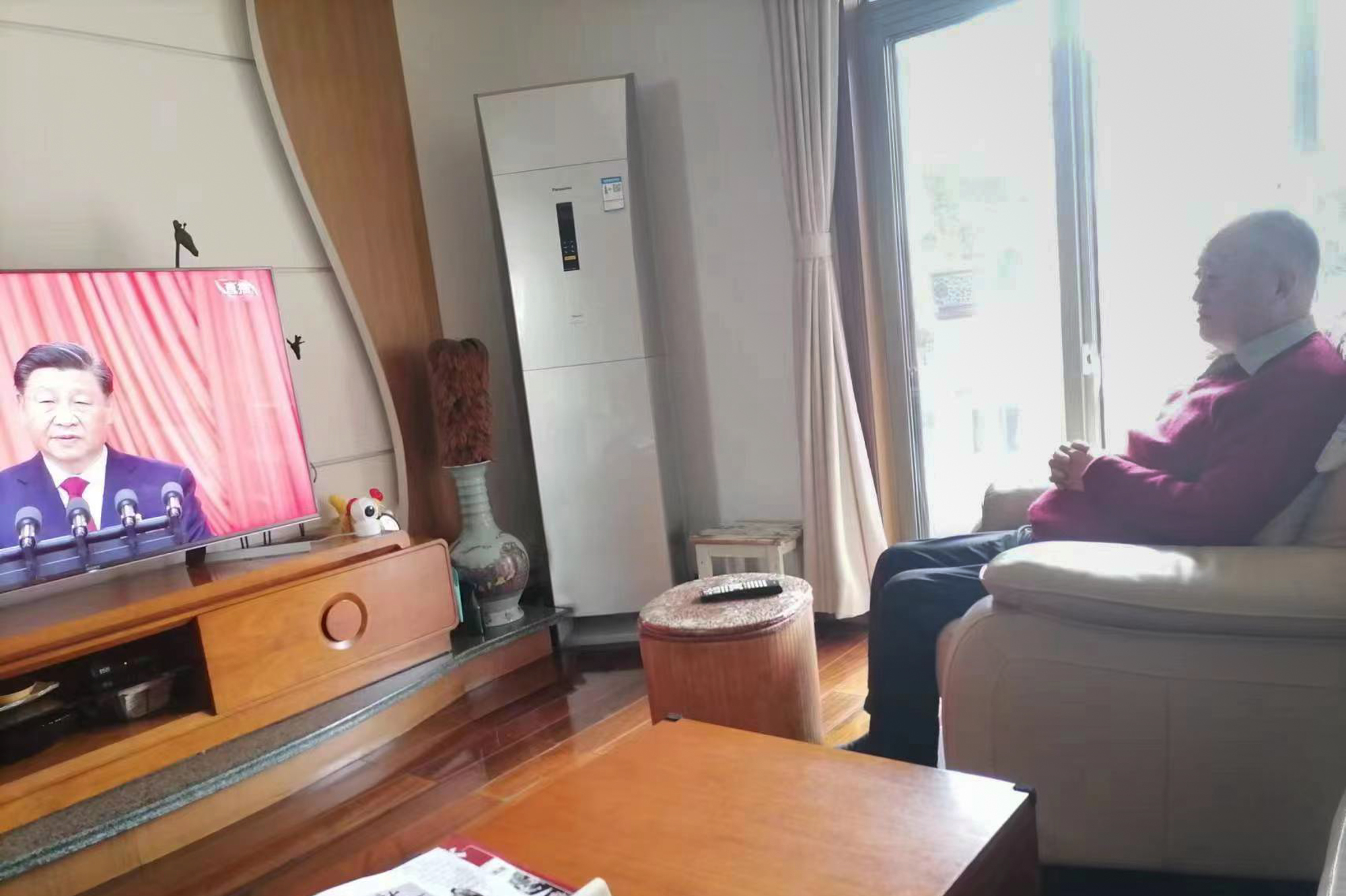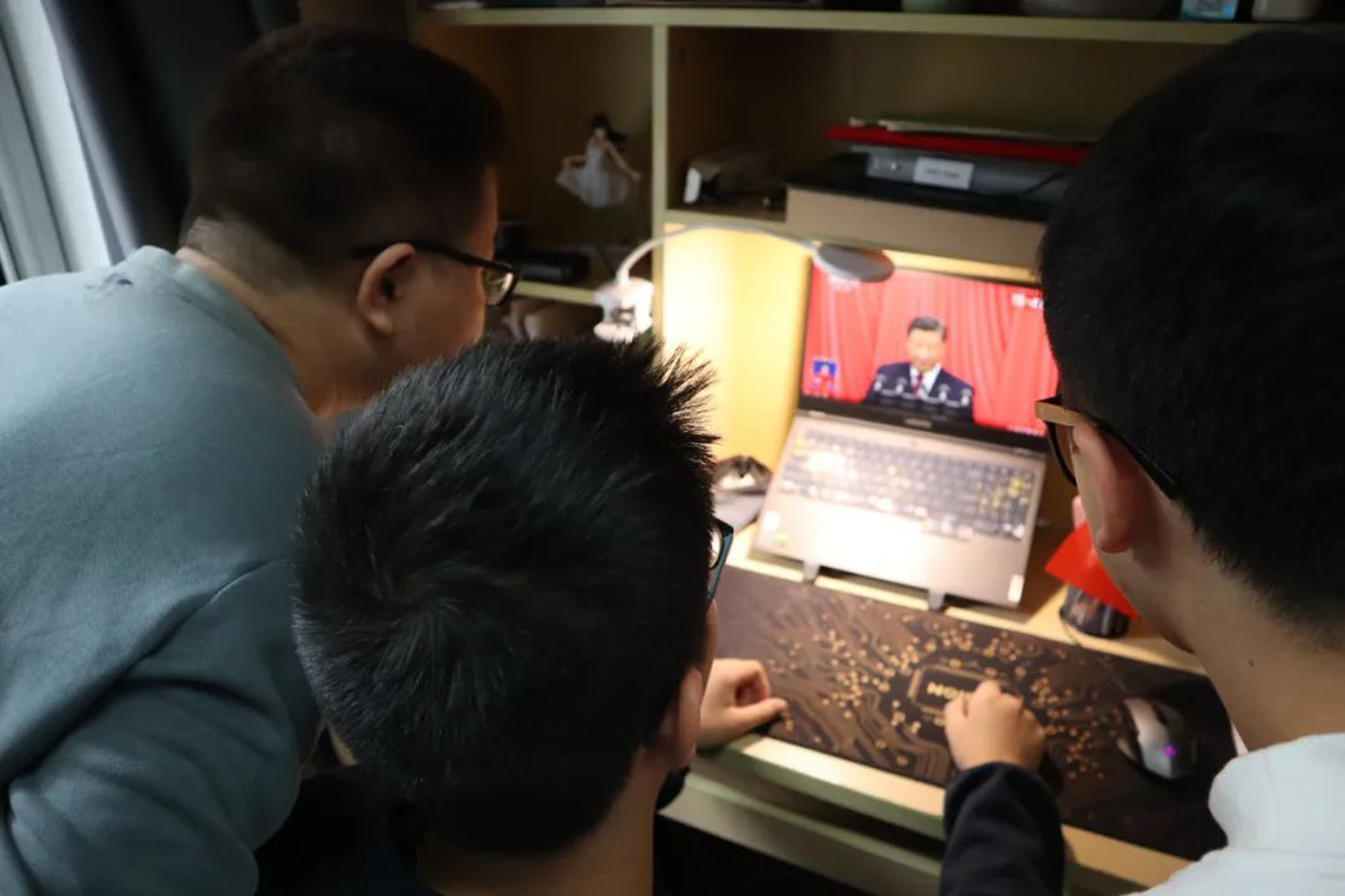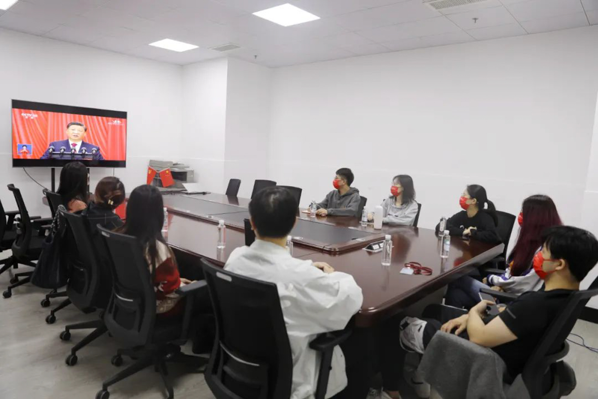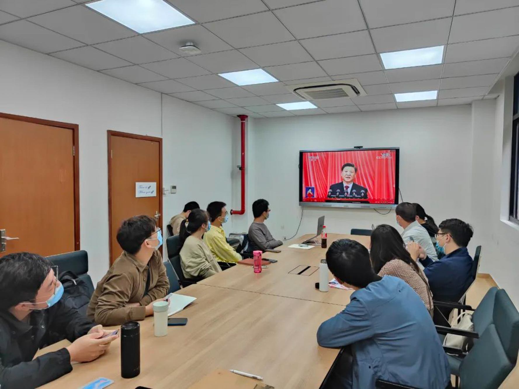 华东师大两校区红旗招展,“热烈庆祝党的二十大胜利召开”的展板分外鲜明,上午10点不到,师生们早早来到屏幕前收看开幕会盛况。华东师大师生或在各会议室、办公室、实验室等公共空间,或在宿舍、家中收看开幕会盛况,一些院系党组织通过开设网络会议室集中收看,关注热议总书记报告。在总书记的报告过程中,收看现场不时自发响起热烈的掌声。
