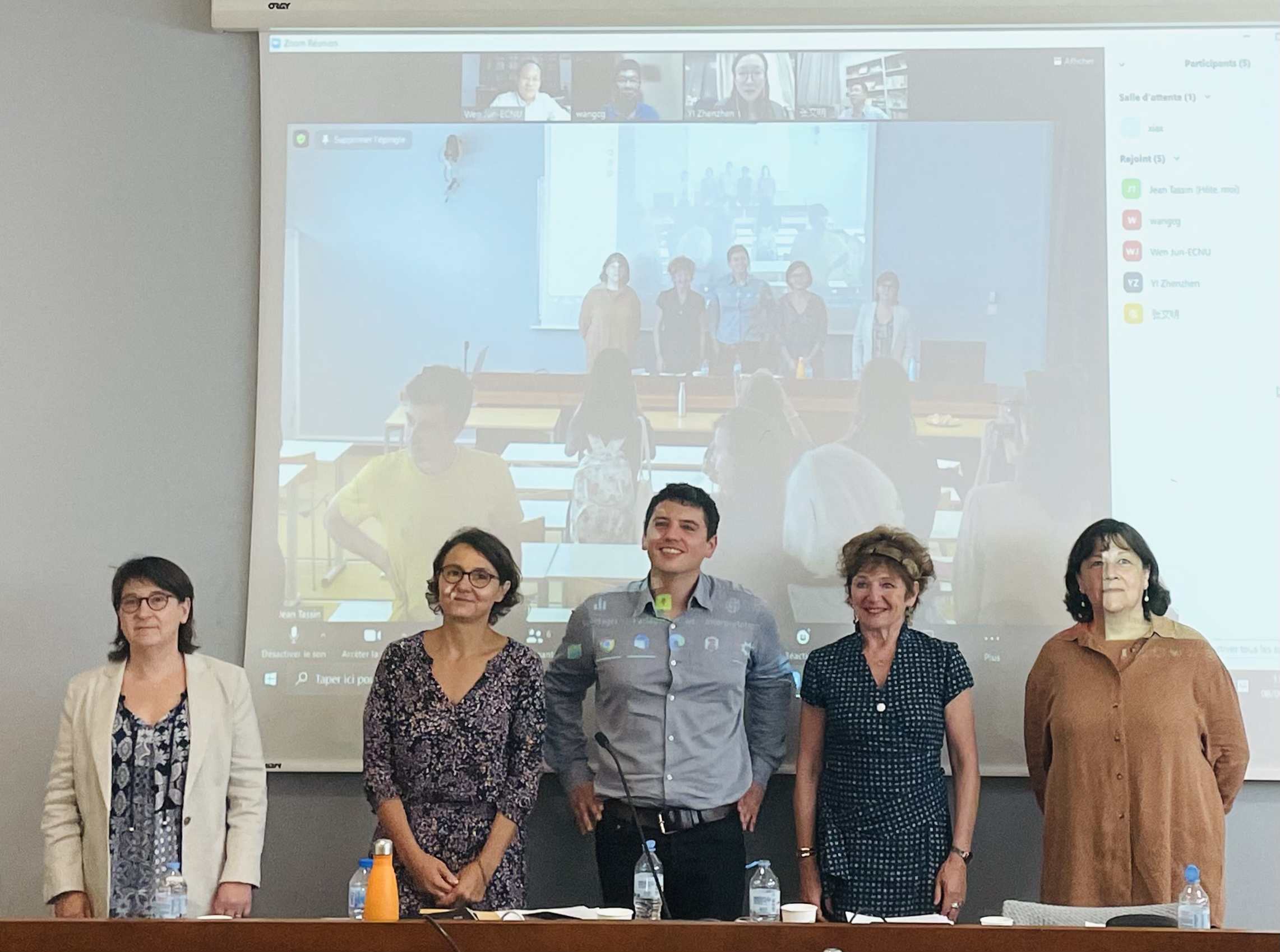 答辩结束后,戴兴然与法方答辩专家、线上中方答辩专家合影。因为疫情原因,他的博士论文答辩会在里昂高师举行
