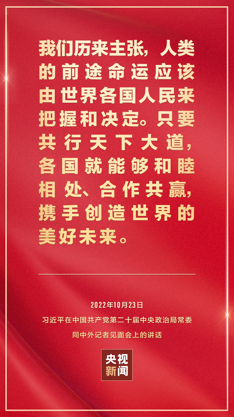 ——新征程上,我们要始终弘扬全人类共同价值。当今世界面临前所未有的挑战。我们历来主张,人类的前途命运应该由世界各国人民来把握和决定。只要共行天下大道,各国就能够和睦相处、合作共赢,携手创造世界的美好未来。