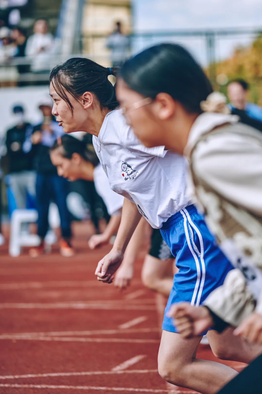 看,他们英姿飒爽,以不怕万难坚定的面貌注视未来;听,他们拍打手鼓,用整齐的鼓声向田径场发出宣战!