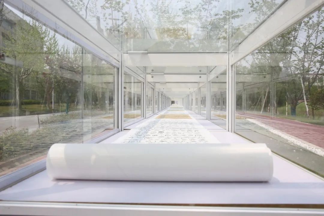 百幅《兰亭序》作品临作装裱成了10个手卷,陈列在玻璃柜中在临河的道路中央绵延了120米,拉开了校园兰亭书法节的序幕。不少同学驻足拍照、打卡,品赏着中国书法的经典。