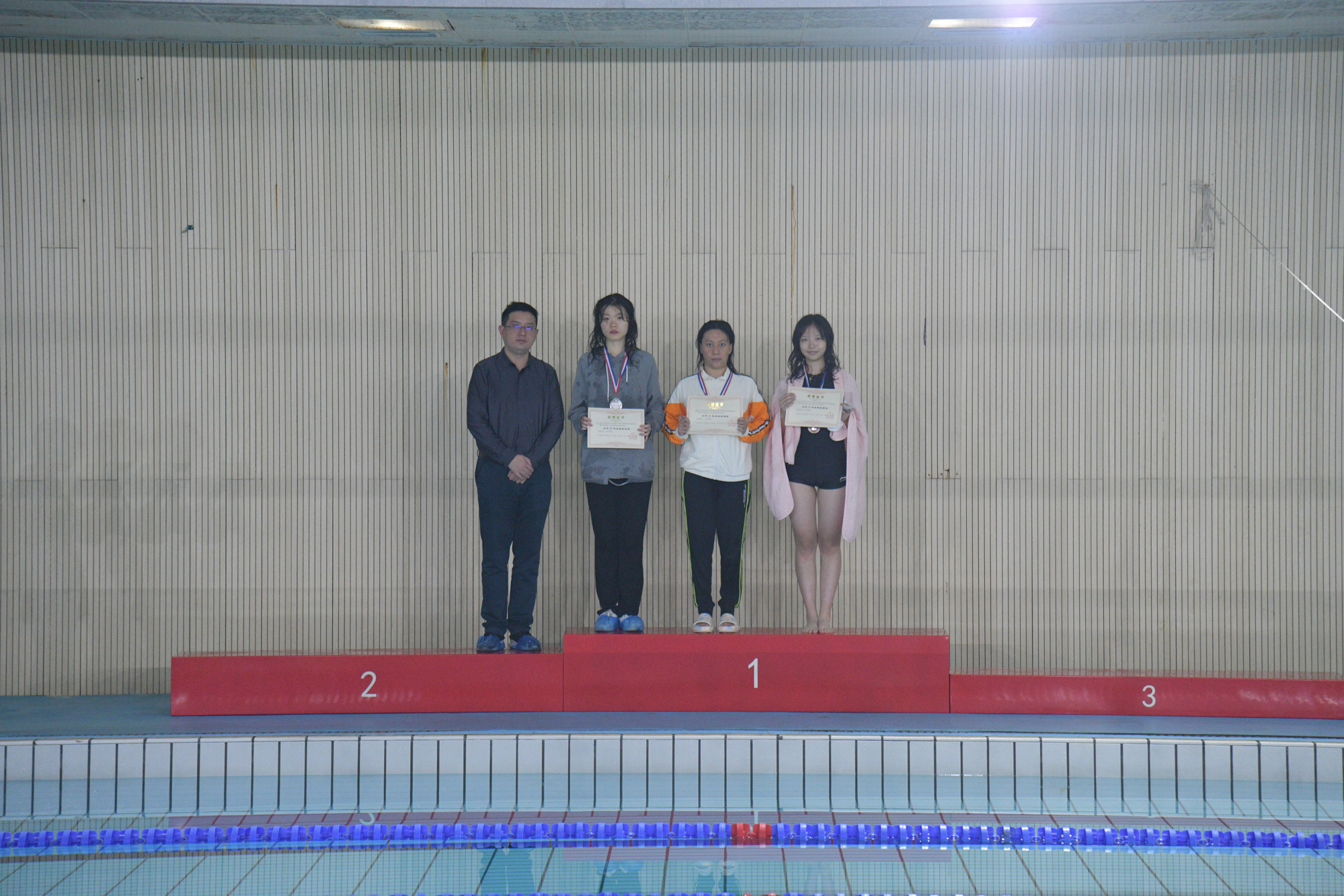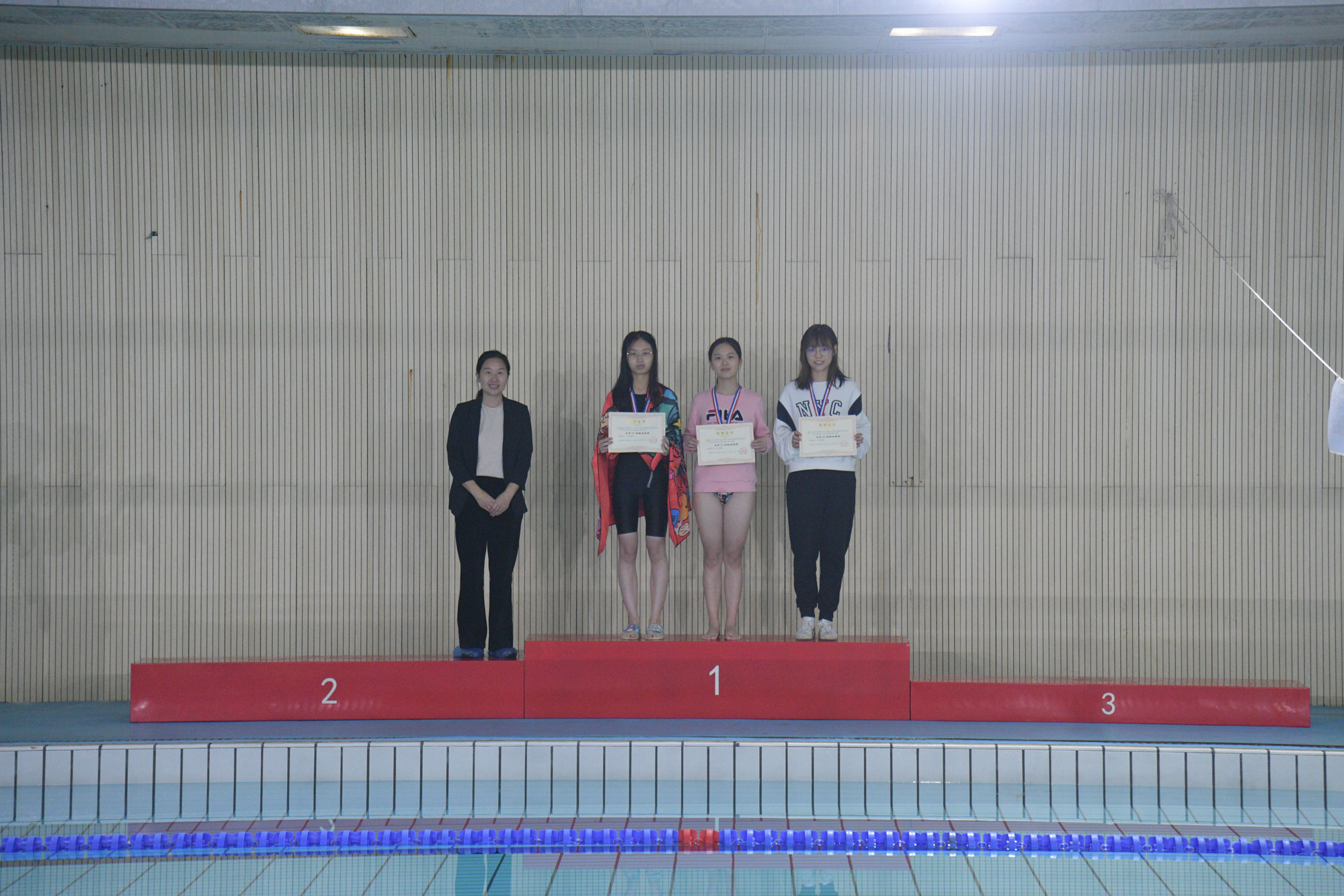 学生(研究生)工作处副处长王新燕为女子25米蛙泳获奖学生颁奖