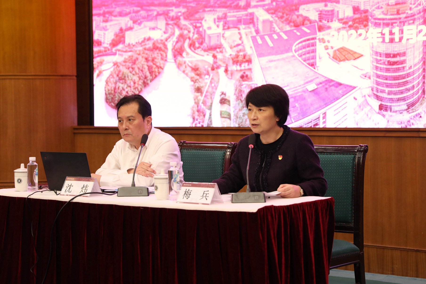 为深入学习党的二十大精神,切实做好学习宣传贯彻党的二十大精神各项工作部署,11月2日下午,澳门永利皇宫官网入口传达学习党的二十大精神大会暨党委中心组学习扩大会通过线上线下相结合的方式举行。党的二十大代表、上海市教卫工作党委书记沈炜应邀作党的二十大精神学习专题辅导报告,校党委书记梅兵主持本次大会。