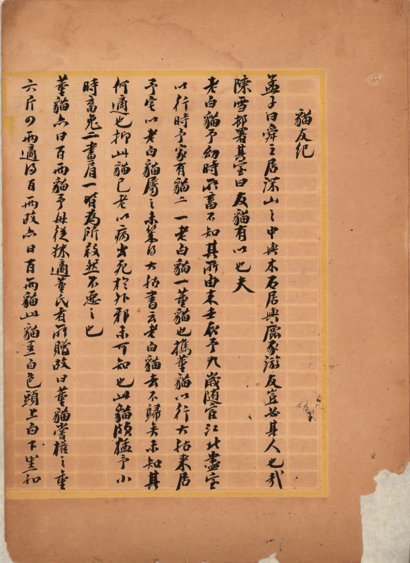 《猫友纪》开头:“孟子曰:舜之居深山之中,与木石居,与鹿豕游,友岂必其人也哉!”
