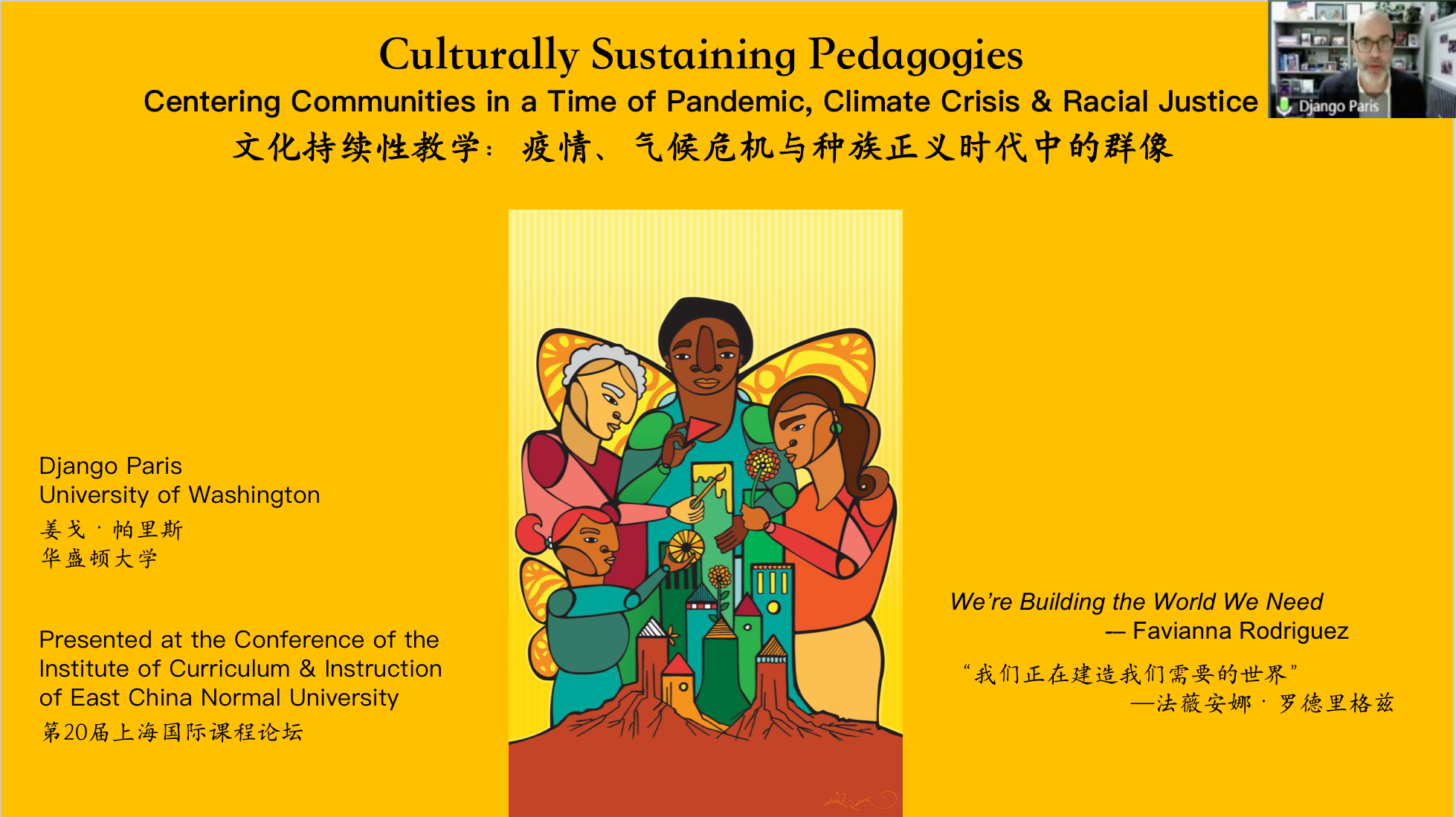 美国华盛顿大学詹姆斯和彻丽·班克斯首任讲席教授,班克斯教育公平中心主任Django Paris作了题为“Culturally Sustaining Pedagogies: Centering Communities in a Time of Pandemic, Climate Crisis, and Racial Justice”(文化持续性教学:疫情、气候危机与种族正义时代中的群像)的报告。他将文化持续性教学作为学校教育的一部分,旨在以积极的社会变革和振兴为目标,贯彻和推动语言、读写和文化的多元性。除此之外,Django Paris教授还厘清了实施文化持续性教学的场景的关键特点,及文化持续性教学在课程和教学领域的实施标准。