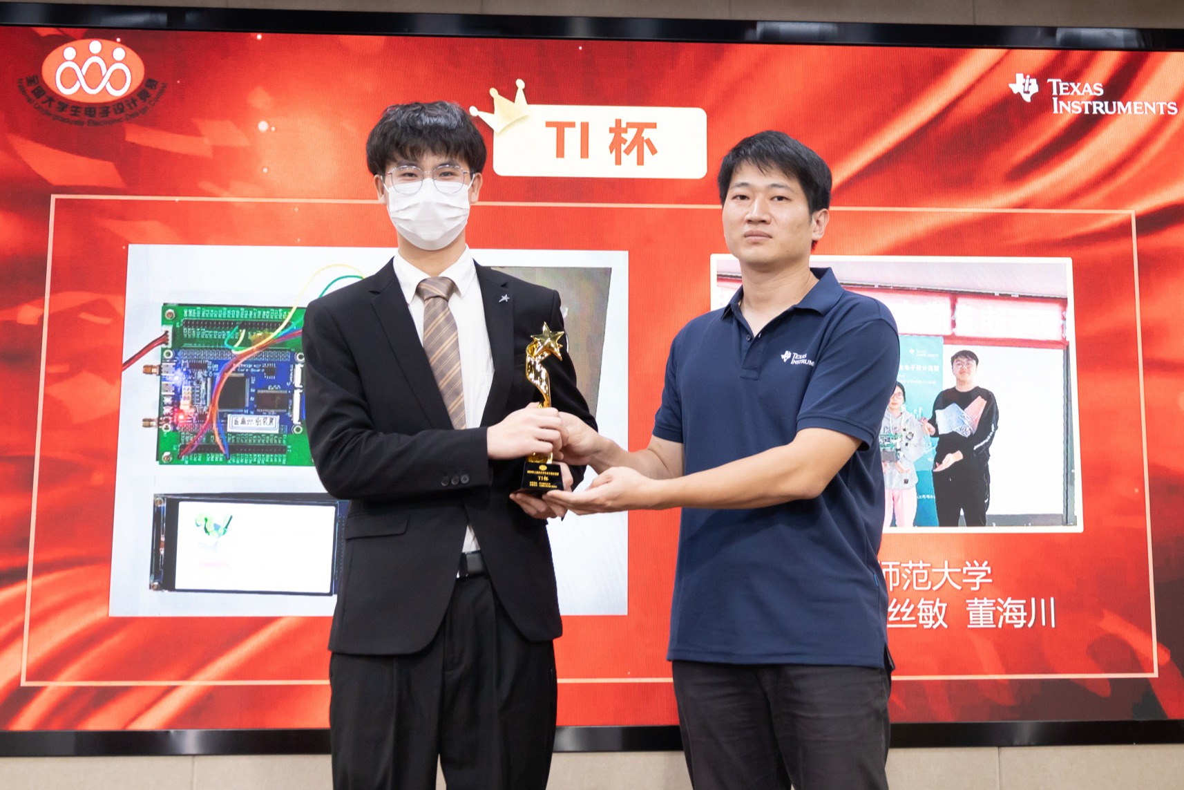 万海缘同学代表团队在颁奖典礼上接受“TI杯”奖杯