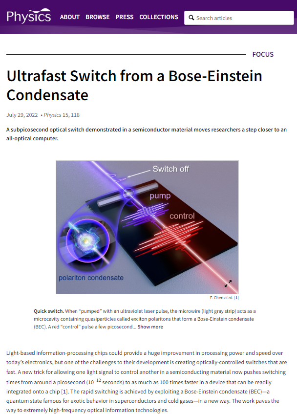 该工作入选美国物理学会编辑部Editors’Suggestions 和 Featured in Physics,并被美国物理学会网站以“Ultrafast Switch from a Bose-Einstein Condensate”为题作为Focus进展报道。