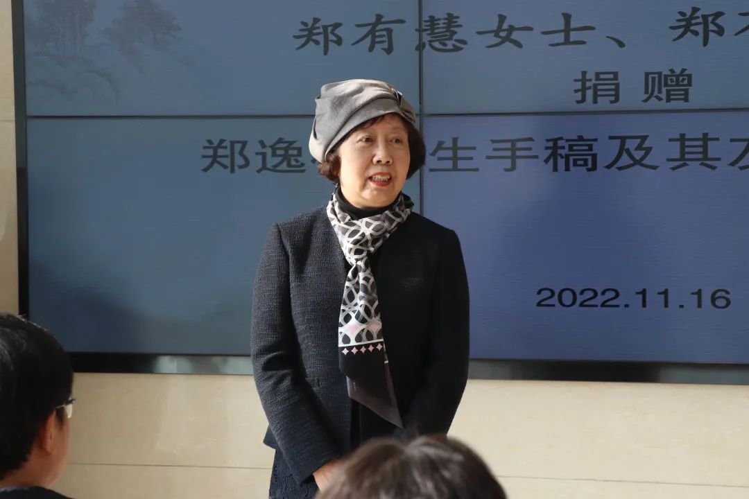 郑有慧女士在仪式上发表了捐赠感言。她谈到,从祖父郑逸梅到她自己的女儿,一门四代都与华东师大有着颇深的渊源,其中三人在华东师大或其前身学校大夏大学学习,郑逸梅先生本人也在五十年代时接到华东师大的兼职教授聘书,但因故未能应聘。郑有慧介绍了郑逸梅的友朋和捐赠物信息,又提到了郑逸梅先生在上世纪六十年代中后期,社会动乱使其个人文化收藏受到巨大损失,而其损失不仅仅是个人,归根结底是祖国文化的巨大损失,是任何个人收藏都抵偿不了的。