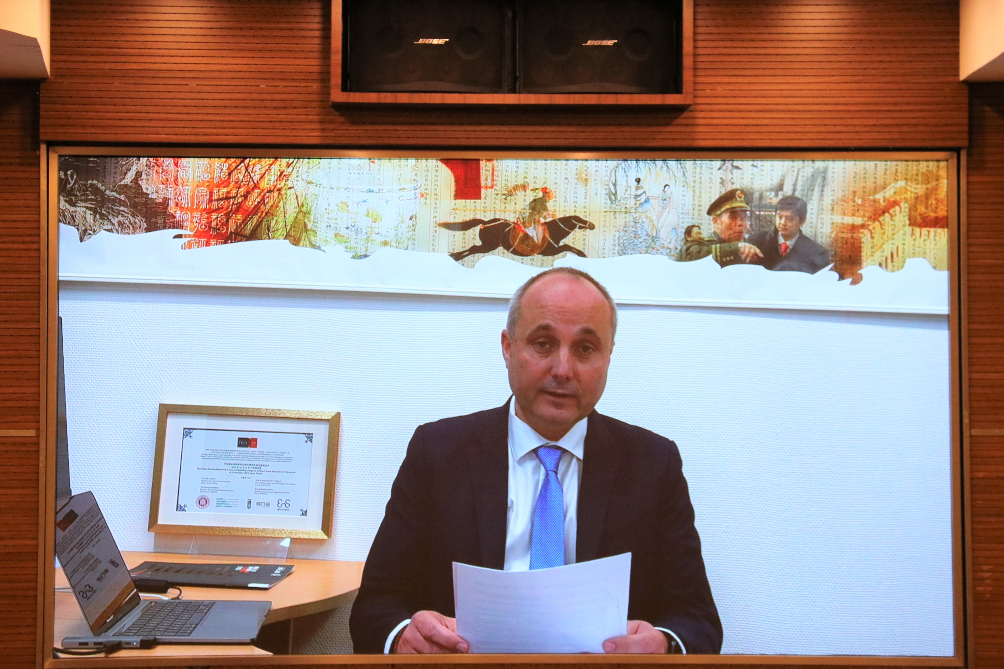 Philippe MAURIN在视频致辞中,代表法国高师学校感谢澳门永利皇宫官网入口和各方参与者对项目发展的支持。他高度肯定了二十年来中法项目的合作成果,并表示未来高师学校将继续加强对项目的支持力度,推动项目的可持续创新发展。