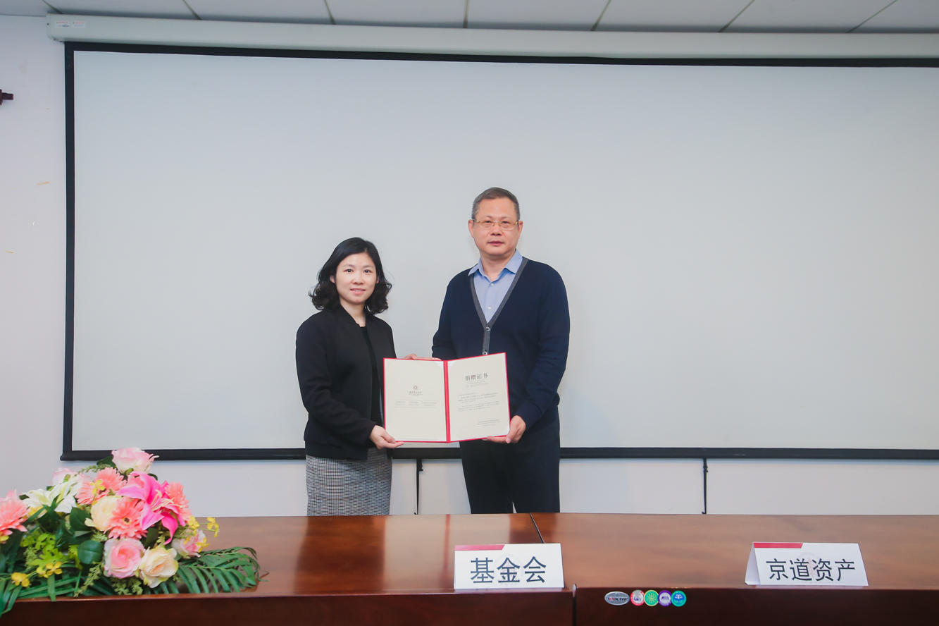 教育发展基金会副秘书长宛姝向何红章校友颁发捐赠证书