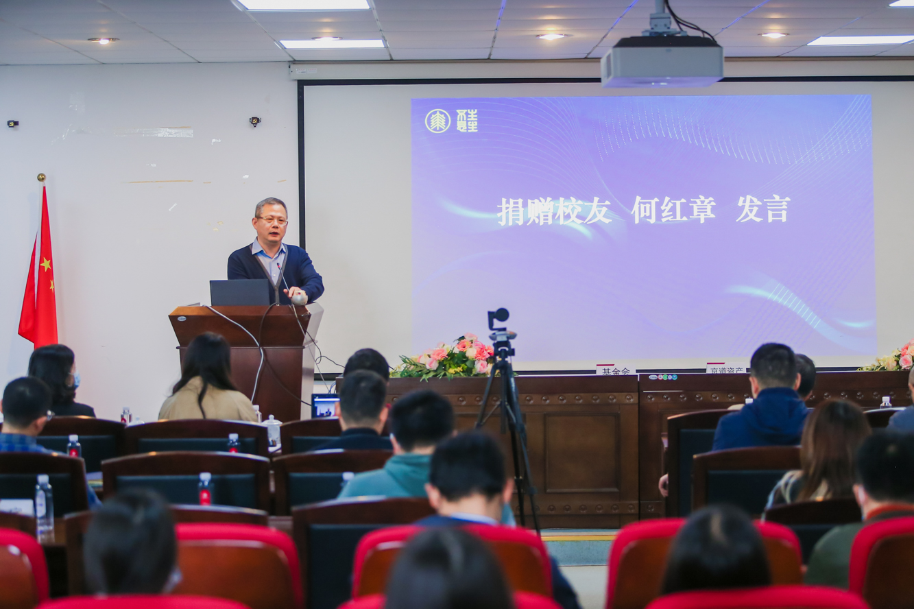 何红章校友在发言中表示,从青葱少年到华发满头,一直感恩铭记着母校的教育和培养,希望能为母校的生命科学研究尽绵薄之力。他通过对“生命与人生”“财富与价值”“机会与关注”三组关键词的解读,展现了一名企业家的强烈使命感。他表示,生命是追求成功和卓越人生的载体,是无价而不可逆的,这也赋予了生命科学研究真正的价值。“泛爱众,而亲仁”,财富可以创造更好的条件帮助他人,进而实现人生价值。他也勉励在校学子要把握人生紧要处,抓住机会,谋定而动。
