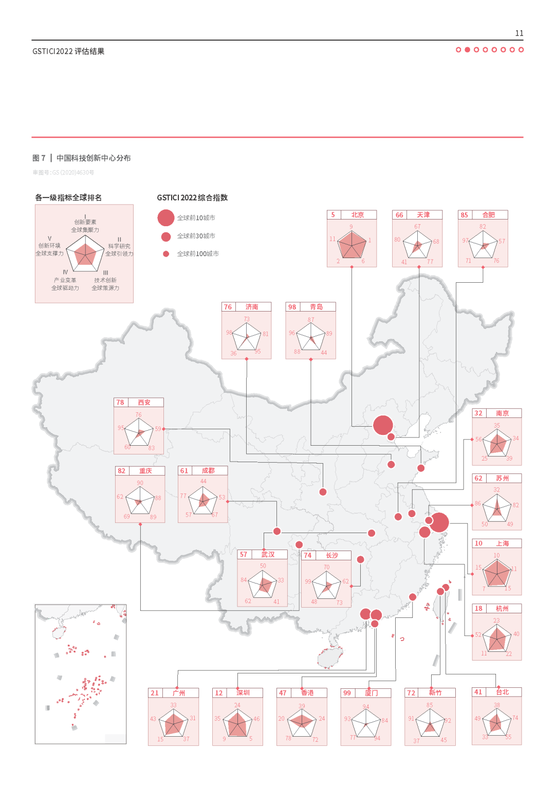(5)中国的全球科技创新中心集中分布在京津冀、长三角和粤港澳大湾区。中国进入全球前100的20个城市,有一半位于京津冀、长三角和粤港澳大湾区。京津冀地区:北京高居全球第5,是中国排名最高的全球科技创新中心,天津排名第66。长三角地区:上海排名全球第10,杭州第18,南京第32,苏州第62、合肥第85;粤港澳大湾区:深圳排名全球第12、广州第21、香港第47。
