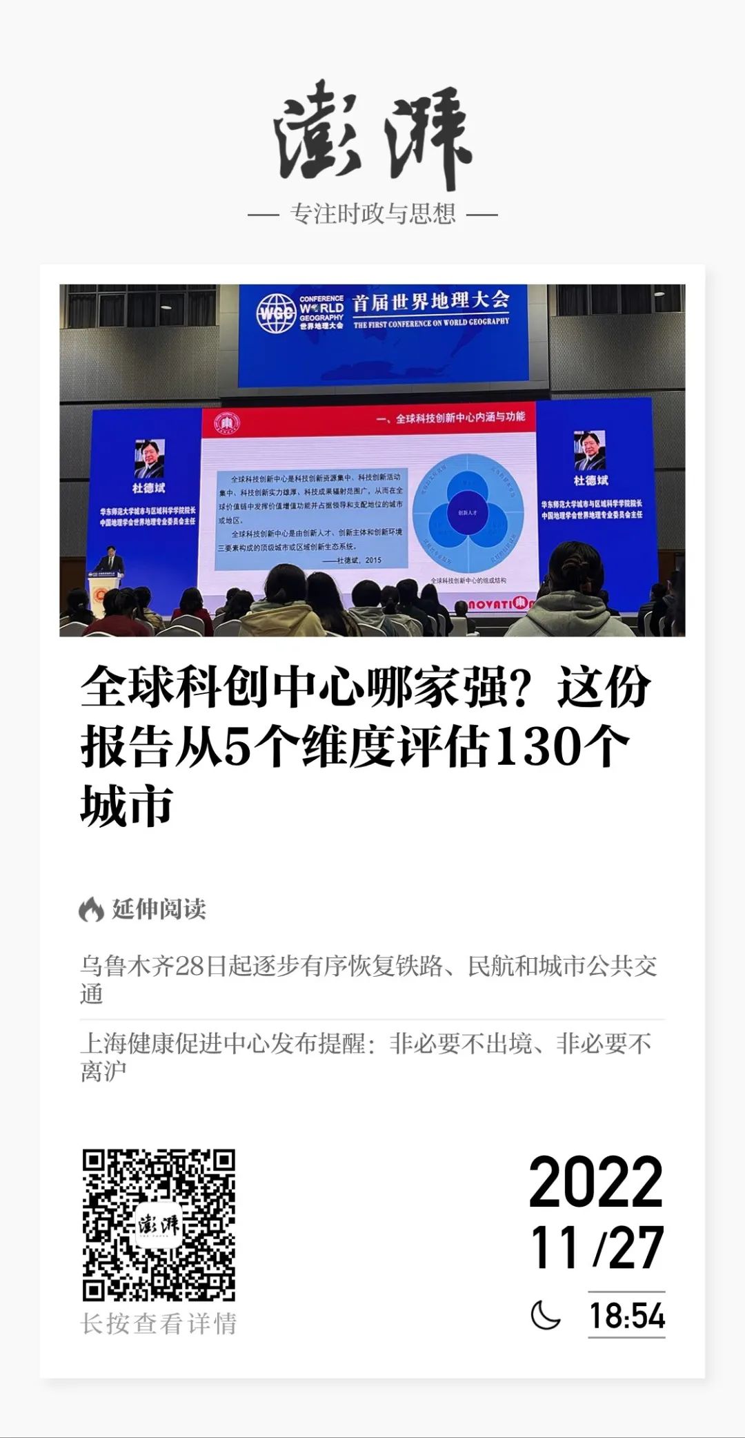 在11月27日闭幕的首届世界地理大会上,澳门永利皇宫官网入口全球创新与发展研究院组织相关力量,从创新要素全球集聚力、科学研究全球引领力、技术创新全球策源力、产业变革全球驱动力和创新环境全球支撑力五个维度,对全球130个城市的科技创新发展水平进行科学测度,形成《全球科技创新中心发展指数2022》(Global S&T Innovation Center Index 2022,GSTICI2022),面向全球发布。