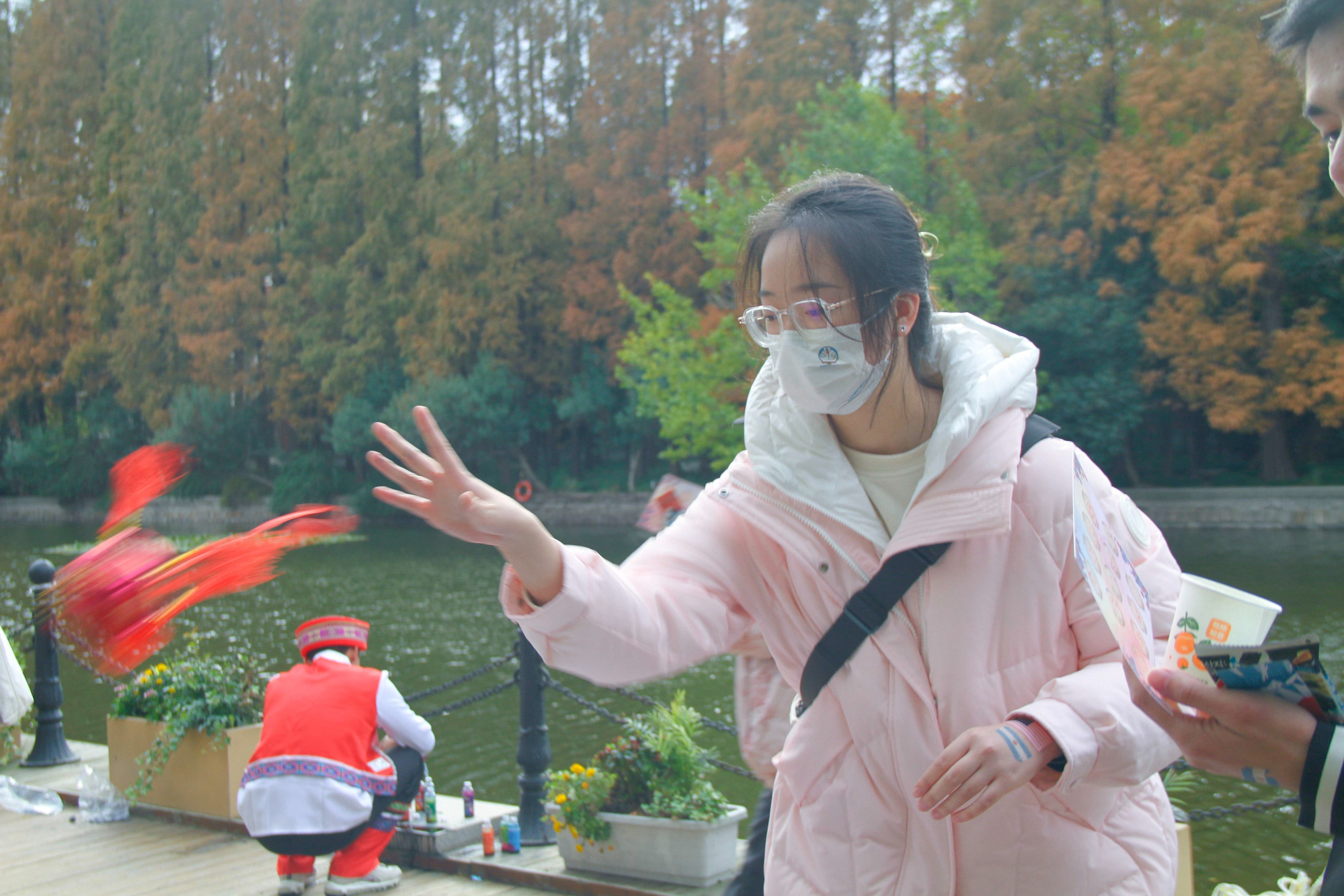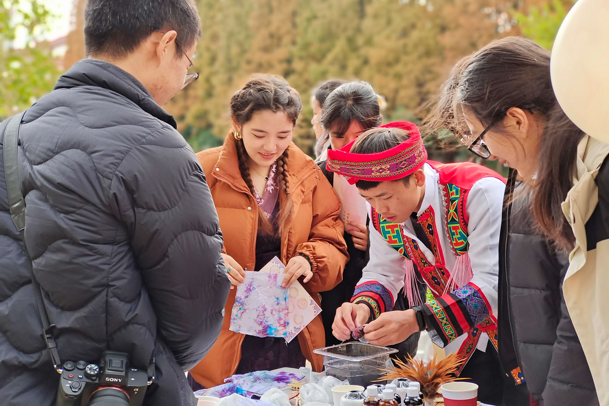 在活动现场,师生们自由游览,在不同民族的展示展台进行服饰体验、集章打卡等活动。面对形形色色精致且富有民族风情的展台和布置,同学们纷纷体验民族服饰,手持民族特色的KT板拍照留念。民族文化交流节在麦西来普大狂欢中落下帷幕。