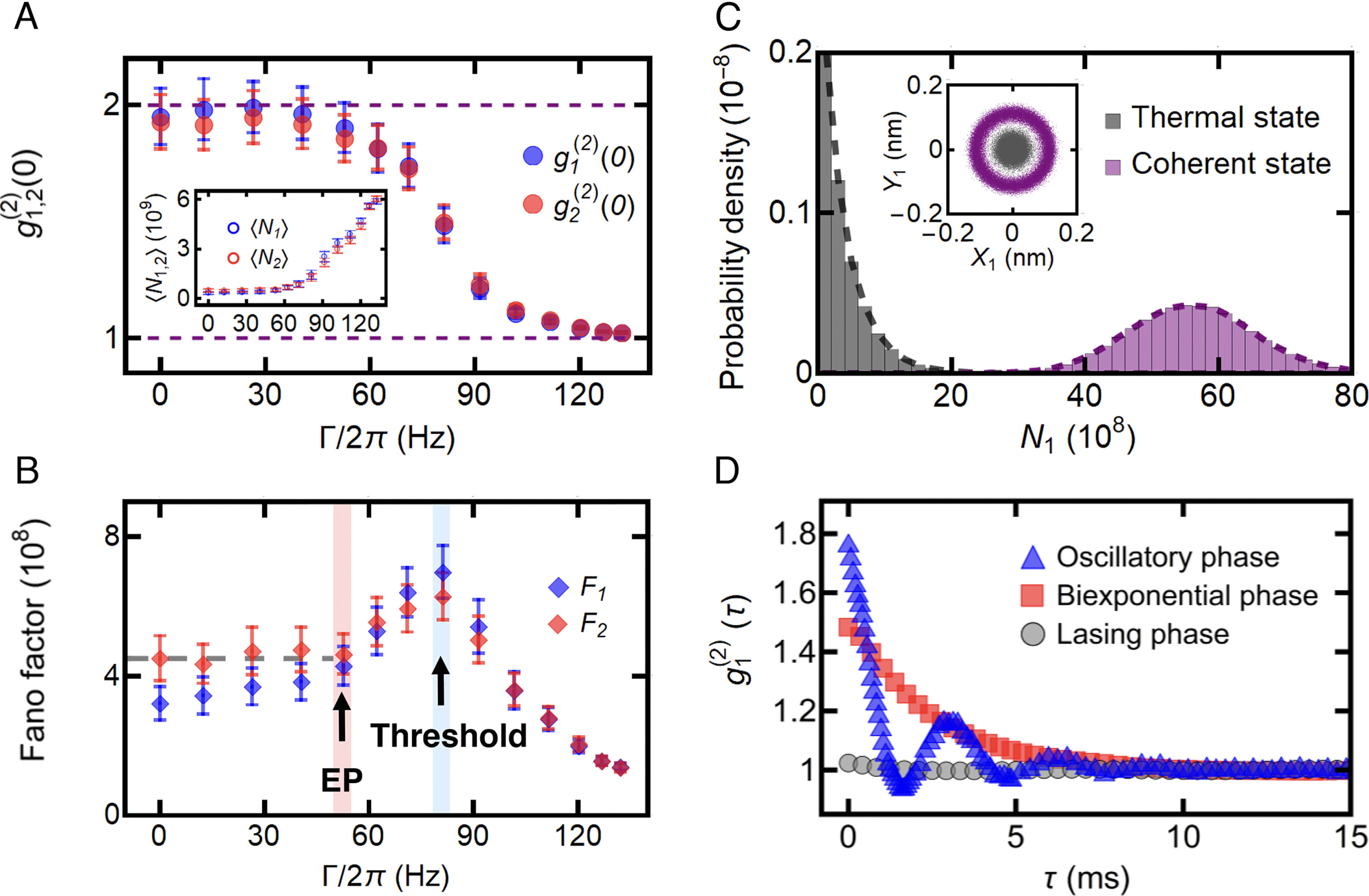 (A,B) 二阶声子相关函数g(2)(0)和Fano因子随耦合强度的关系;(C)不同耦合强度下测量的声子统计分布;(D)不同区间的g(2)(t)