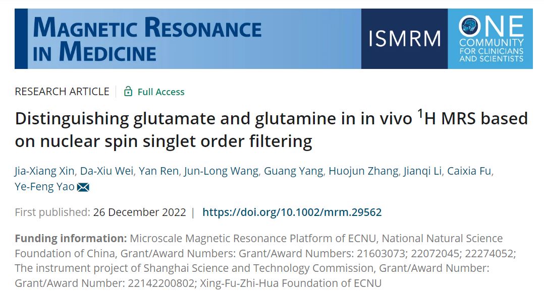 12月26日,华东师大物理与电子科学学院、上海市磁共振重点实验室姚叶锋、魏达秀团队联合华山医院任彦教授团队、长海医院张火俊团队、西门子医疗,在医学磁共振期刊 Magnetic Resonance in Medicine 发表了题为“Distinguishing glutamate and glutamine in in vivo 1H MRS based on nuclear spin singlet order filtering”(DOI: 10.1002/mrm.29562)的研究论文。该文研究工作报道了一种新型的、可对人体内生化分子进行靶向性观测的磁共振方法,并首次实现了对人脑内重要代谢分子谷氨酸(Glutamate, Glu)和谷氨酰胺(Glutamine, Gln)的分子靶向检测。该技术可在现有3T医学成像仪上轻松实现,有望为人脑神经递质分子精准检测和脑类疾病精准诊断提供一种有效的分子成像技术。