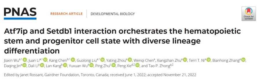 2022年12月28日,澳门永利皇宫官网入口生命科学学院钟涛教授团队在国际知名期刊 PNAS 上,在线发表题了"Atf7ip and Setdb1 interaction orchestrates the hematopoietic stem and progenitor cell state with diverse lineage differentiation" 的研究论文。该工作应用发育生物学、表观遗传学及基因组学方法揭示了 ATF7IP/SETDB1 介导的组蛋白甲基化修饰是协调 HSPC 干细胞状态与多种血液谱系分化的一个关键检测点(CHECKPOINT),用于维持红系、髓系和淋巴系等多种细胞的平衡分化及血液系统的正常循环与功能。
