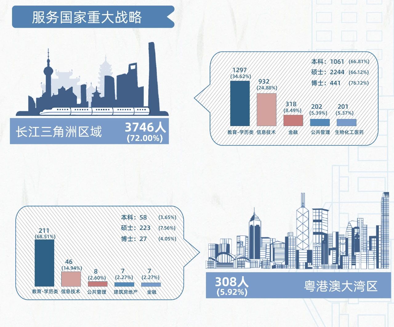更多毕业生赴中国航天科技、中国兵器装备、中国船舶、中国稀土等航空航天、能源、军工等重点战略行业领域就业。