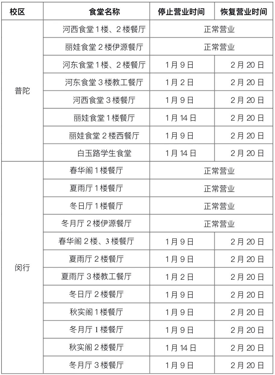 属于各位ECNUers的寒假,今天就正式开始啦!2023年寒假自1月9日(星期一)至2月25日(星期六)止,很多同学们留校不回家过年,特此送上寒假校园服务指南,请大家收好~