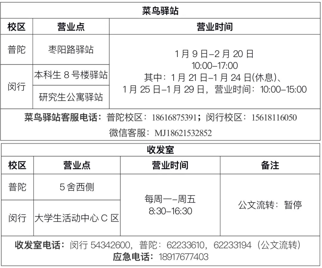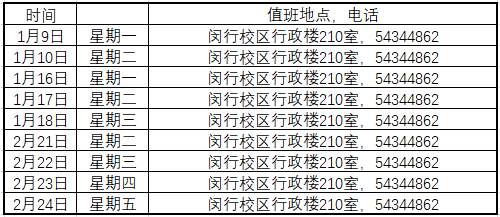 1月9日至2月24日(周一至周五)分两校区值班。事务办理时间:上午8:30-11:30,下午1:30-4:30。