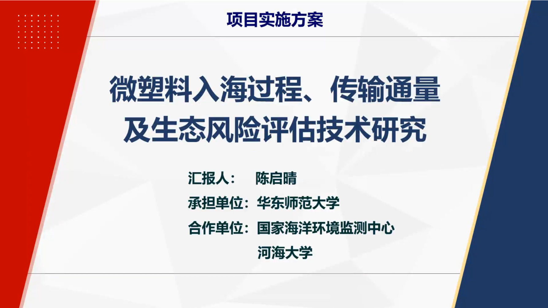 项目汇报由北京大学陶澍院士主持,五位项目首席分别就各项目的研究背景、研究内容、实施方案和考核指标等进行了汇报。华东师大黄晔研究员、陈启晴研究员分别以“抗生素及其抗性基因环境行为及生态效应评估技术”“微塑料入海过程、传输通量及生态风险评估技术研究”为题展开阐述。专家组听取报告后,开展了充分的交流讨论,对实施方案提出了针对性的建议,建议各项目之间加强合作和交流,找准科学问题和技术难点,力争获得突破性、创新性的标志性成果。