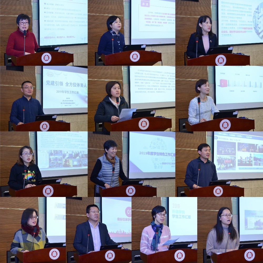 会上,法学院、国际关系与地区发展研究院、河口海岸科学研究院、美术学院、社会发展学院、生态与环境科学学院、数据科学与工程学院、数学科学学院、思勉人文高等研究院、体育与健康学院、外语学院、哲学系、中国语言文学系等13家单位进行现场交流汇报,分别介绍了本单位2019年度学生常规工作、重点工作和特色工作的开展情况。与会人员根据各单位现场或书面交流汇报,对35家单位的年度学生工作开展情况进行了民主测评。