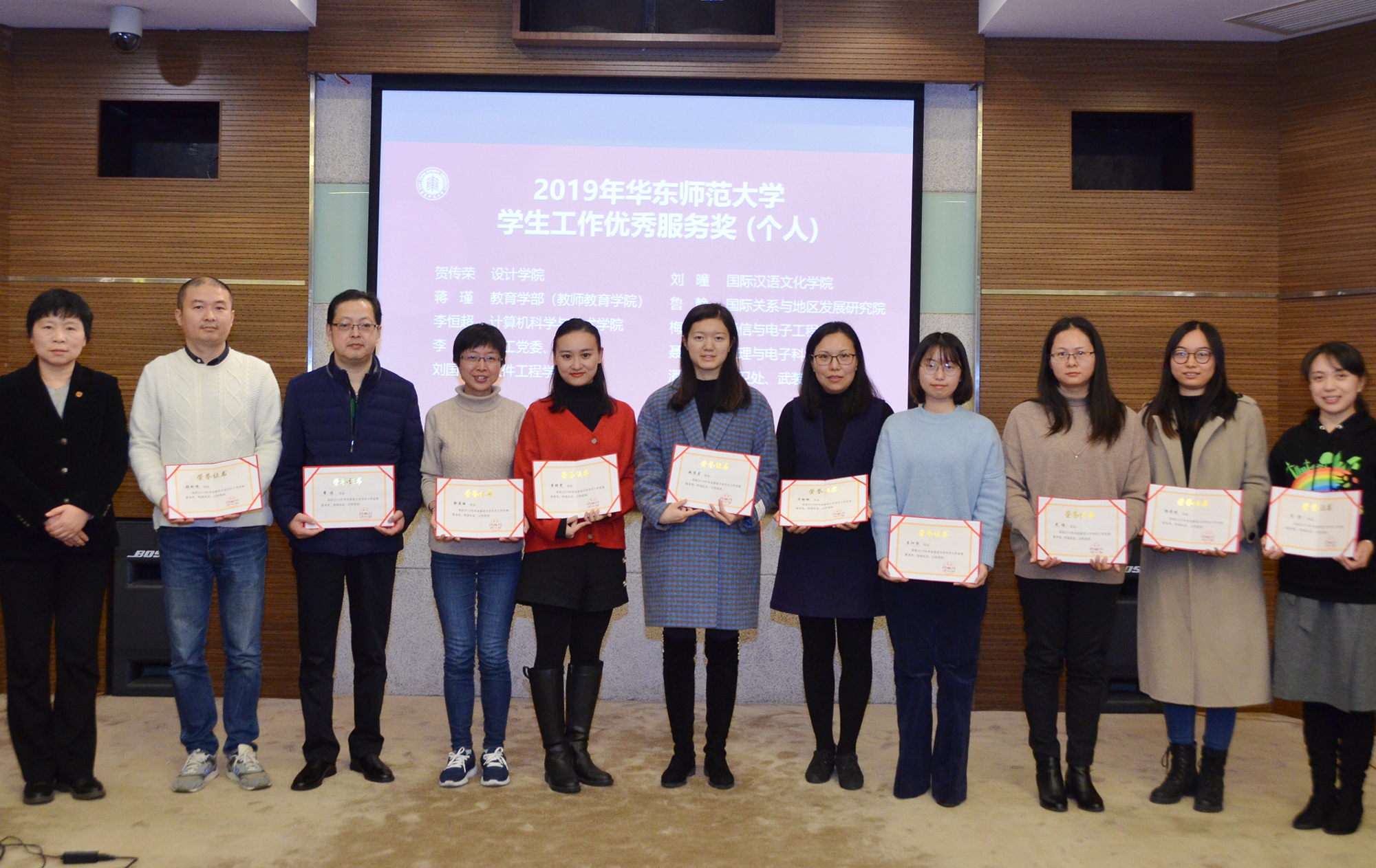 会上,余佳首先宣读了华东师大2018-2019学年优秀学生思想政治工作者、2019年华东师大学生工作优秀服务奖的表彰决定,学生职业发展中心主任刘继亮宣读了2018-2019学年澳门永利皇宫官网入口就业工作先进集体、就业先进集体鼓励奖和就业先进个人的表彰名单,杨昌利为获奖的单位和教师颁奖。学工党委副书记杨艳红宣读华东师大首批五育并举精品项目和五育特色辅导员工作室名单,余佳为受到资助的精品项目和工作室颁发证书与授牌。