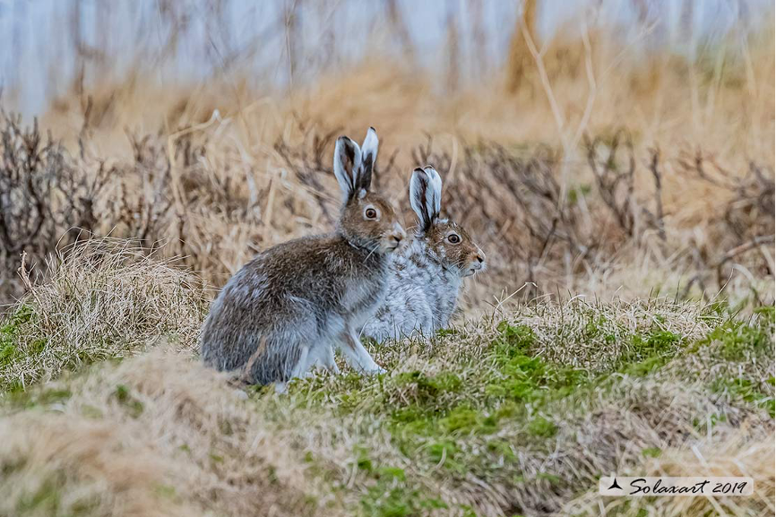在兔子家族中,除了基本配色棕色系外,也有一些兔子毛色鲜明,例如在我国新疆和黑龙江的两个省区的最北端有分布的雪兔(Lepus timidus)Mountain Hare。夏季的毛色普普通通,但到了冬季,除了耳朵尖,其他全变成了白色,这当是为了适应雪地逐渐演化而来。