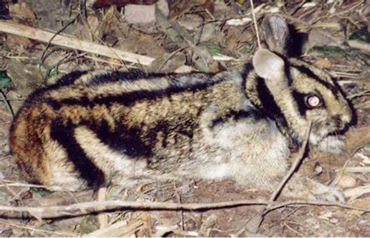 接下来这几位的外貌可就各具特色了,首先登场的是苏门兔属 Nesolagus的苏门答腊短耳兔(Nesolagus netscheri)Sumatran Striped Rabbit。这种小兔子身上长有老虎一般独具特色黄黑相间的纹路,十分奇特。