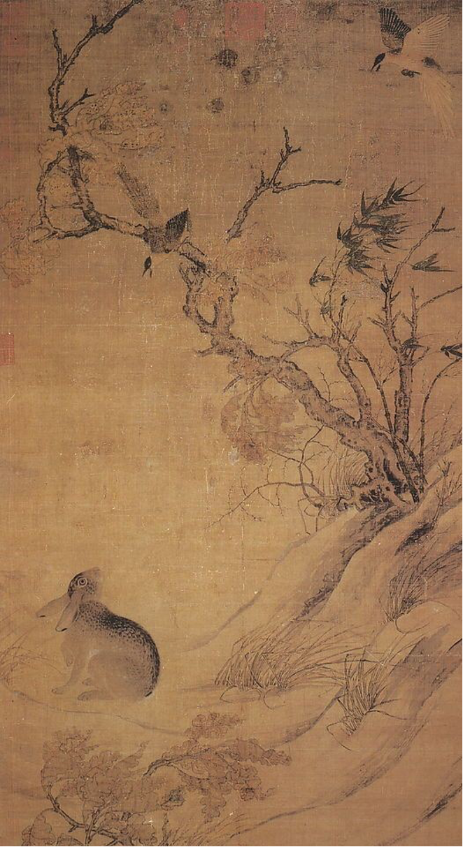 如果我们有机会观察古画,你还会发现宋代之前古画中绘制的白兔基本都是黑眼睛的正常野兔,甚至还有很多直接画的就是正常色型的野兔。例如北宋画家崔白的《双喜图》,画的就是一只野兔(大概率是华南兔)和一只灰喜鹊对视。