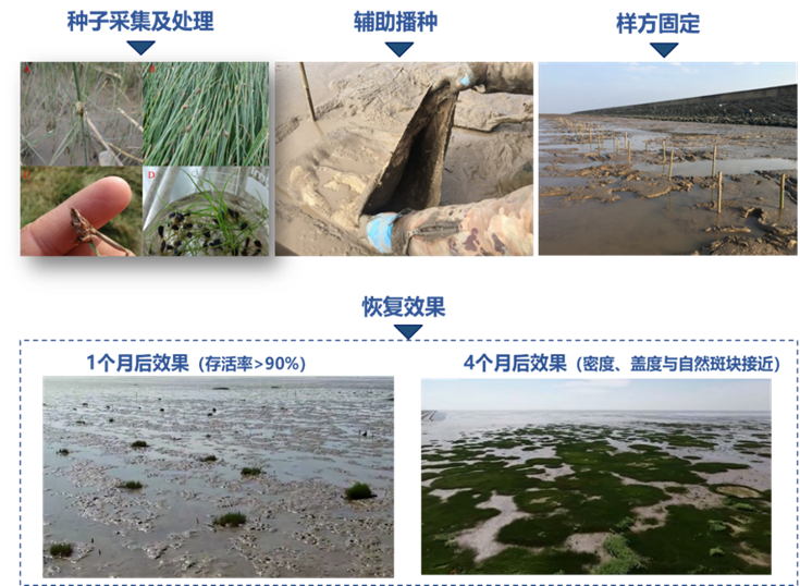 相关技术已在上海市崇明东滩鸟类自然保护区的盐沼修复中得到了应用及示范,成功修复和重建海三棱藨草群落面积达100公顷以上,并已应用于上海市水务局“十四五”海岸带种青工程南汇东滩片区,成功重建海三棱藨草群落面积达10公顷以上,展现出极具价值的推广前景。