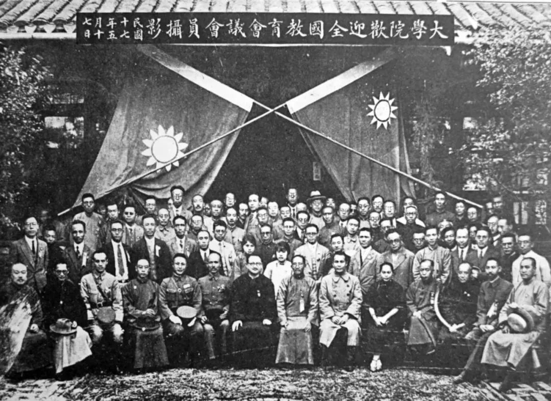 1928年第一次全国教育会议合影。前排左四为孟宪承,左八为蔡元培