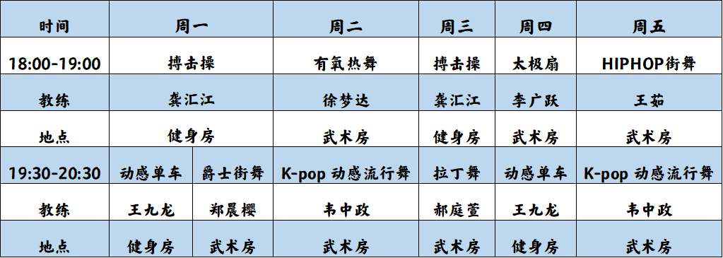 “健康再加倍”,丰富的运动中心课程,总有一款让你想“加练再加练”。为丰富广大师生课余生活多样性,ECNU运动中心推出搏击操、动感单车、太极扇、街舞、拉丁舞、流行舞等多样操课供大家选择。