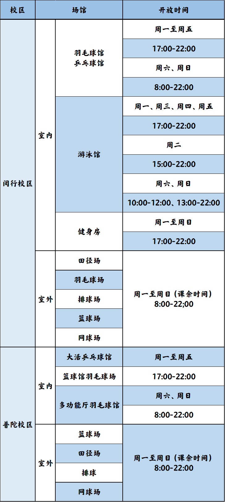 注:闵行校区新增5片室外羽毛球场地,位于体育与健康学院入口处彩虹桥下。