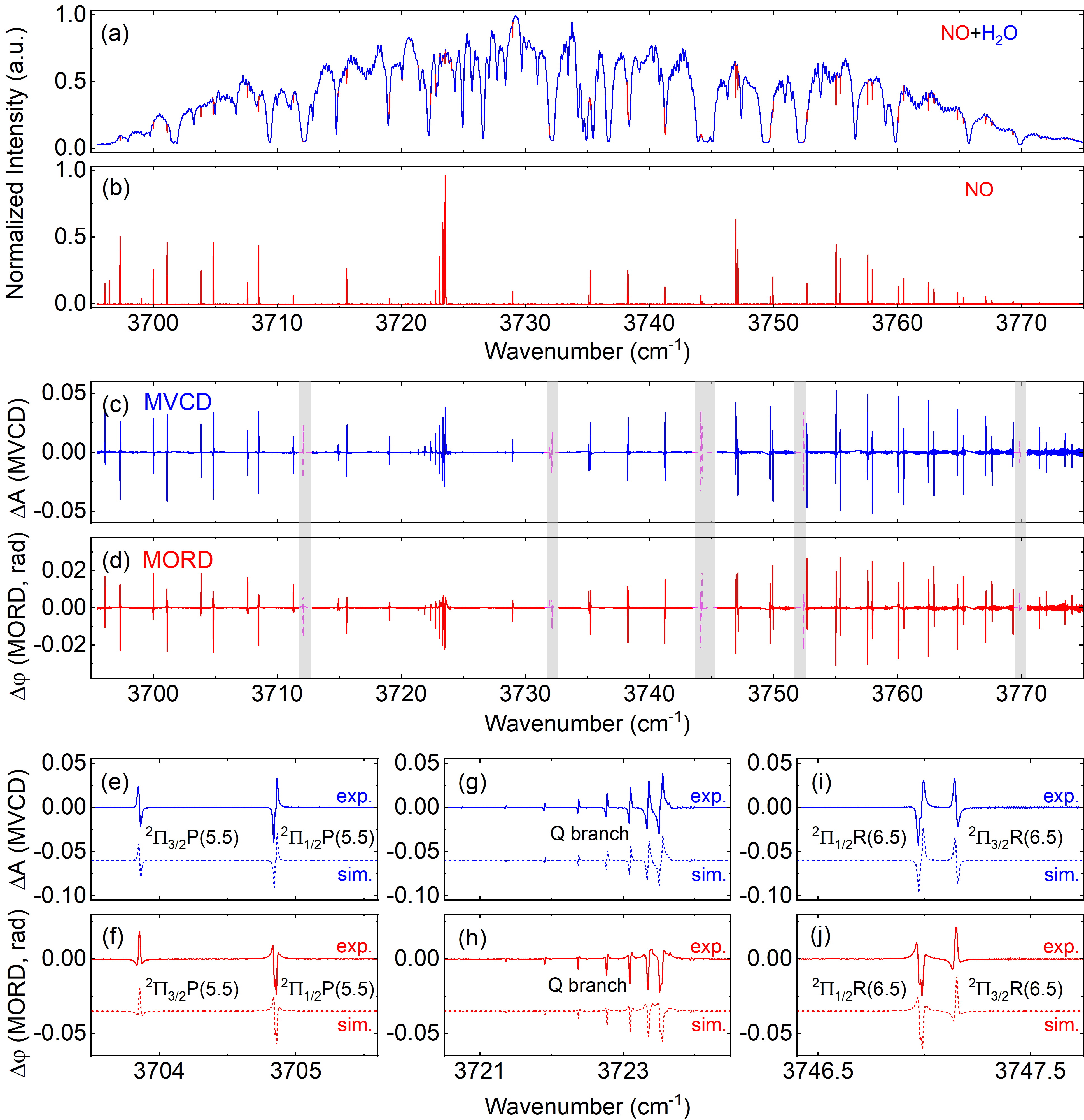 双梳-光活性光谱探测技术具有选择性探测优势,只针对性测量具有光活性分子。如NO分子的2ν0振动带,与水分子吸收带有着大量重叠,双梳-光活性光谱技术选择性探测NO分子振转跃迁,消除了来自反磁分子(空气中的水蒸气)的干扰。这一技术优势为未知自由基的光谱校准和分析以及复杂反应过程中自由基的分子动力学研究提供了新方法。
