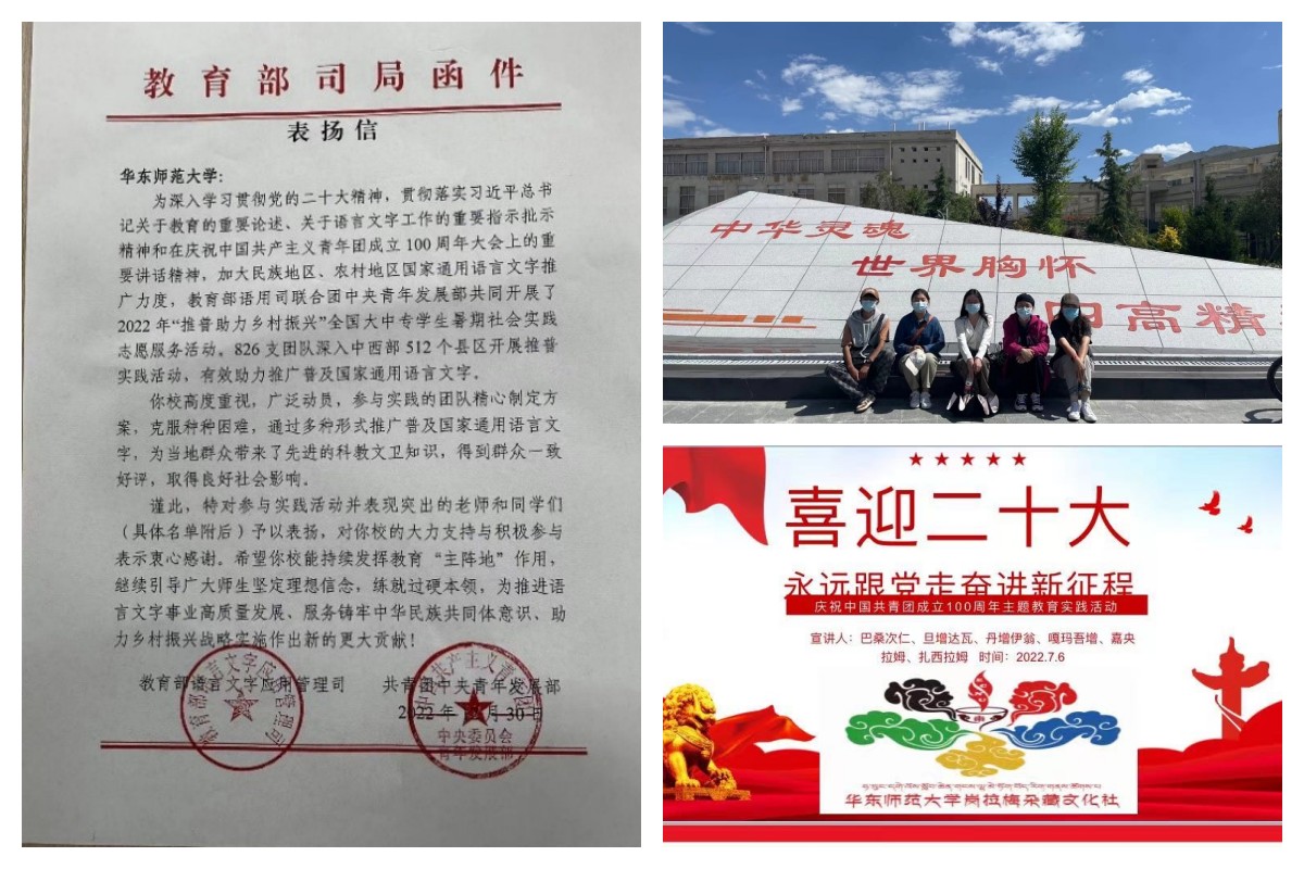 在来自教育部、共青团中央的表扬信中写到,“团队精心制定方案、克服种种困难,通过多种形式推广普及国家通用语言文字,为当地群众带来了先进的科教文卫知识,得到群众一致好评,取得良好社会影响”。这是对“岗拉梅朵”藏文化社支教团开展的推普实践活动的赞誉。社团自2009年发起以来,多次推动进藏的实践活动,曾获评第十批全国民族团结进步示范单位、上海市民族团结进步标兵集体等,受到广泛认可。