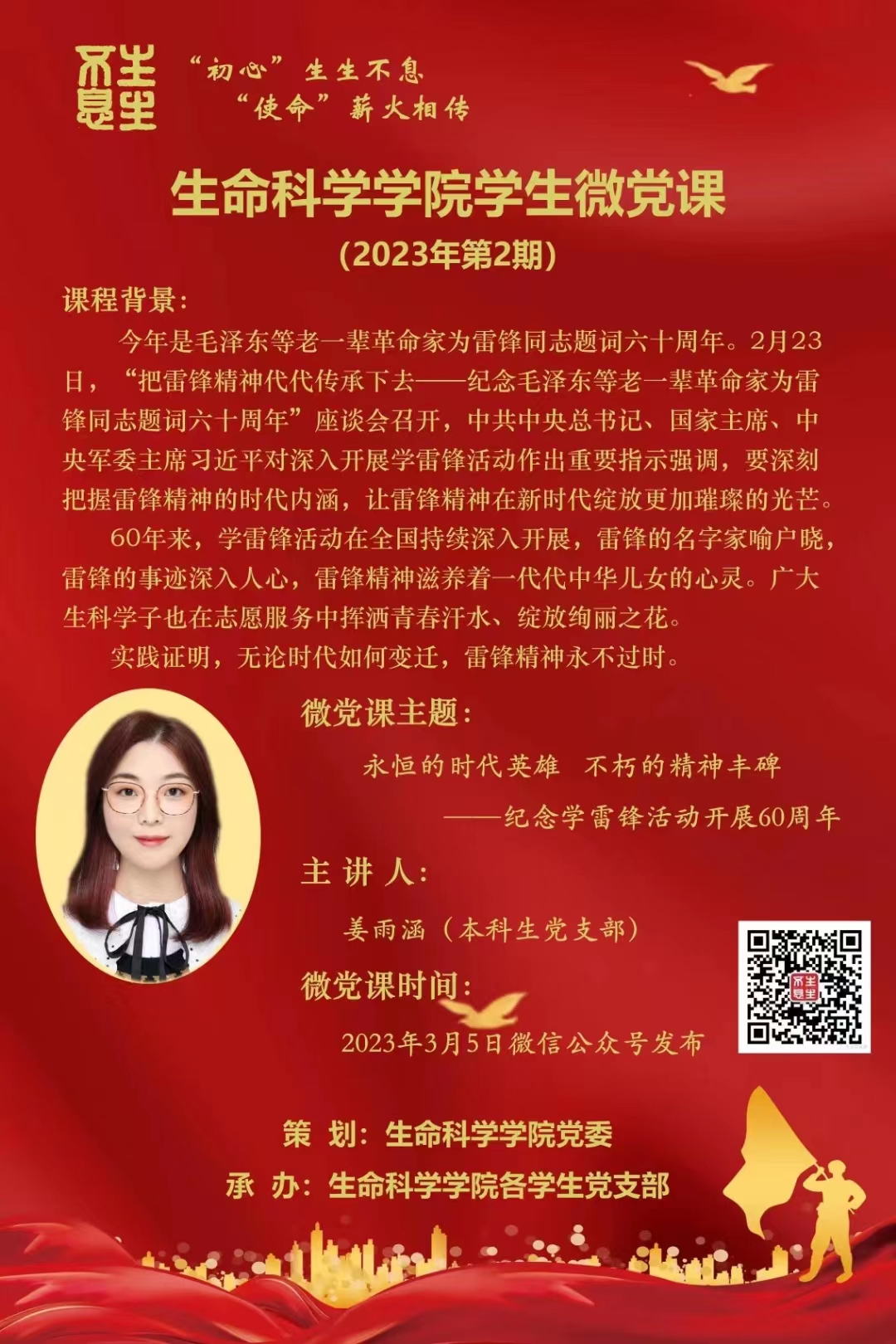 3月5日前夕,生命科学学院的科普志愿者们在生物博物馆、浦江镇青少年社区文化活动中心等地,围绕生命教育开展科普志愿服务活动,践行雷锋精神。此外,学院还将于近期推出学生微党课《永恒的时代英雄 不朽的精神丰碑——纪念学雷锋活动开展60周年》,带领广大青年深刻把握雷锋精神的时代内涵,让雷锋精神在新时代绽放更加璀璨的光芒。