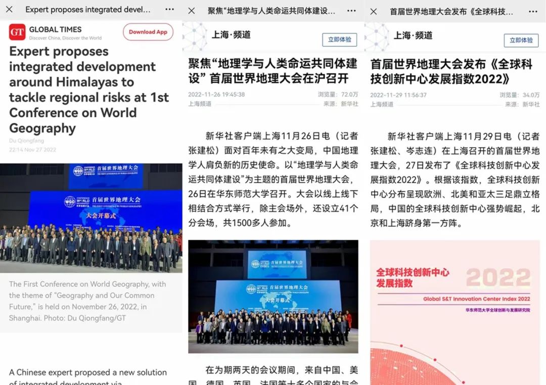 新华社全程跟进采访,连发《聚焦“地理学与人类命运共同体建设” 首届世界地理大会在沪召开》《首届世界地理大会发布<全球科技创新中心发展指数2022>》多篇报道,阅读量破百万。